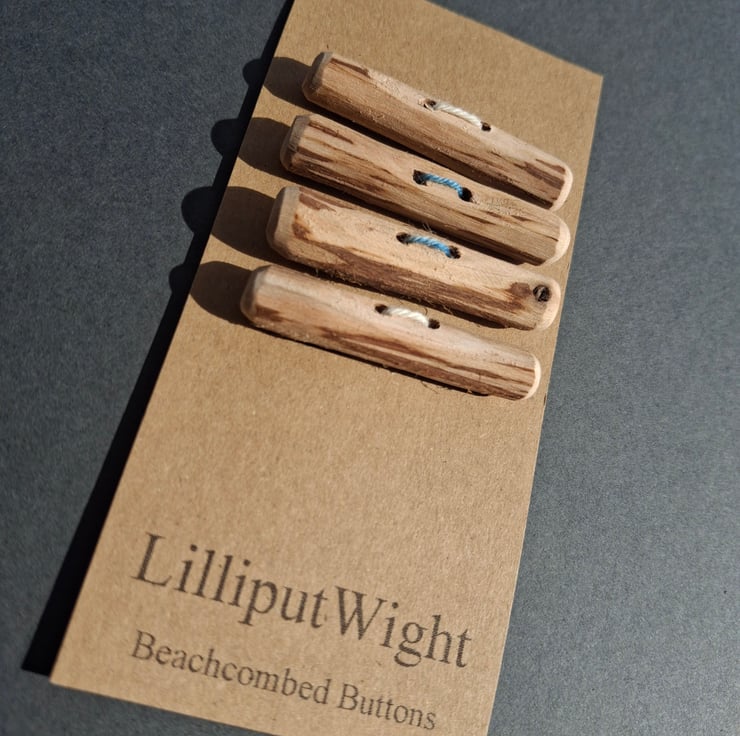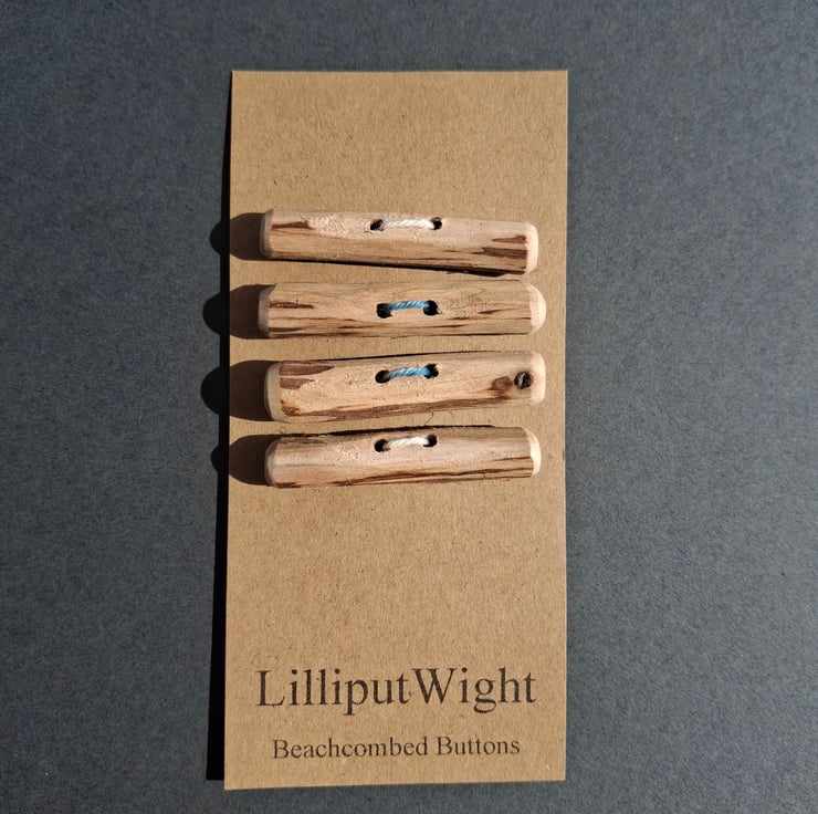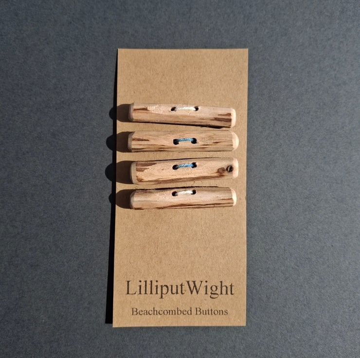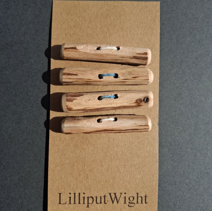 This set of four toggle style buttons has been handmade from driftwood collected from the beach close to my home on the Isle of Wight. These natural wood buttons would be perfect on a squashy garter stitch cardigan.