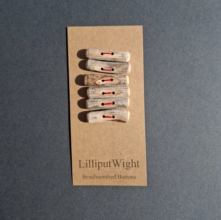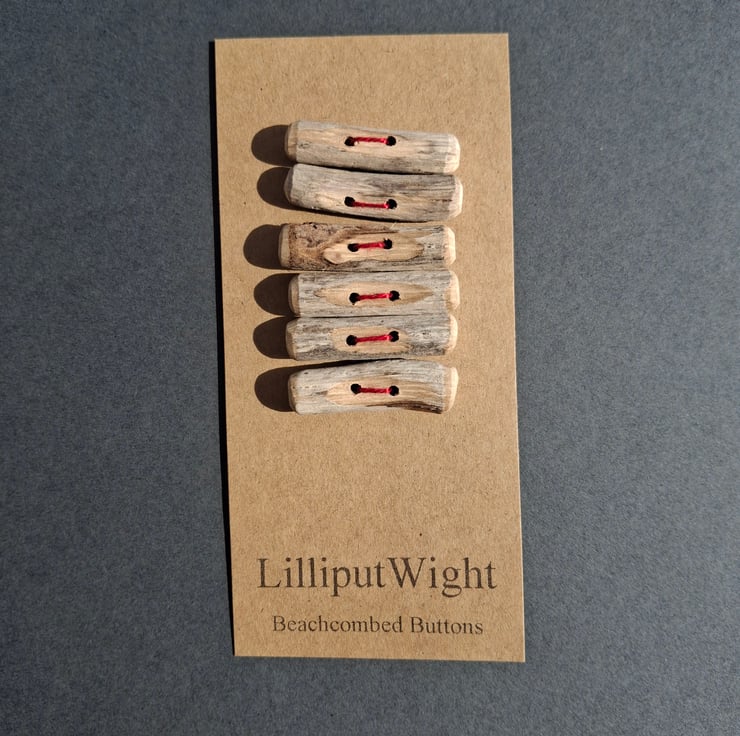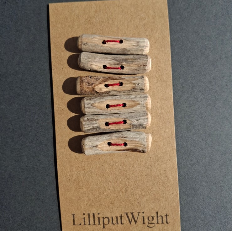 This set of six toggle style buttons has been handmade from driftwood collected from the beach close to my home on the Isle of Wight. These natural wood buttons would be perfect on a squashy garter stitch cardigan.
