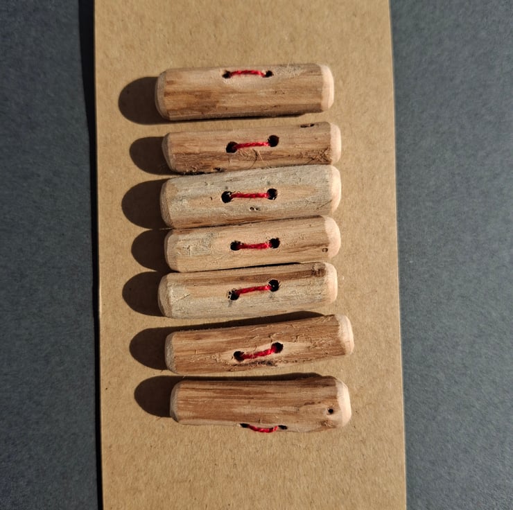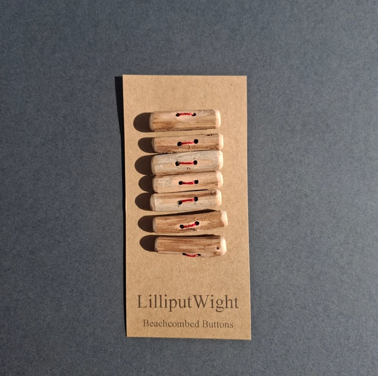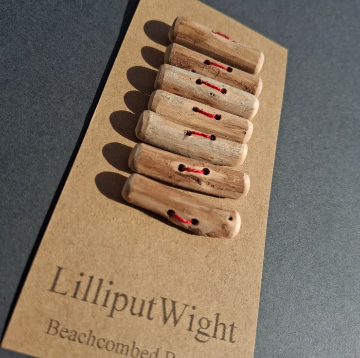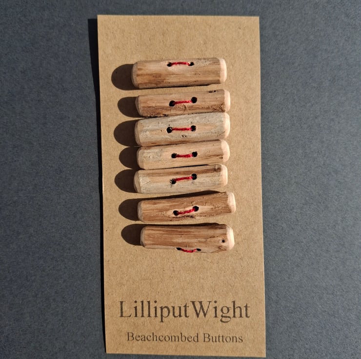 This set of seven toggle style buttons has been handmade from driftwood collected from the beach close to my home on the Isle of Wight. These natural wood buttons would be perfect on a squashy garter stitch cardigan.