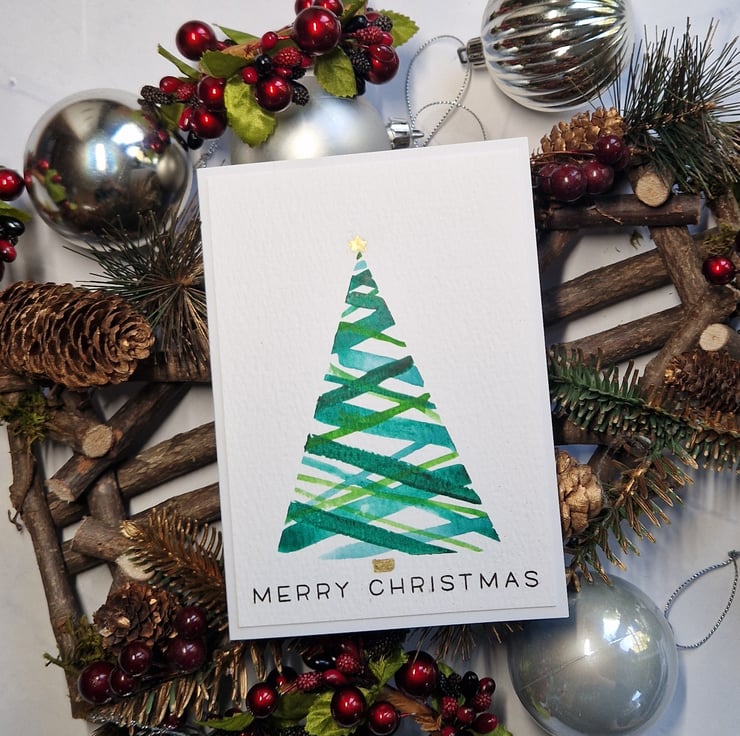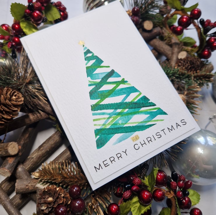 A beautiful watercolour card featuring a Christmas tree painted with stripes of different green and teal shades, and gold detailing.