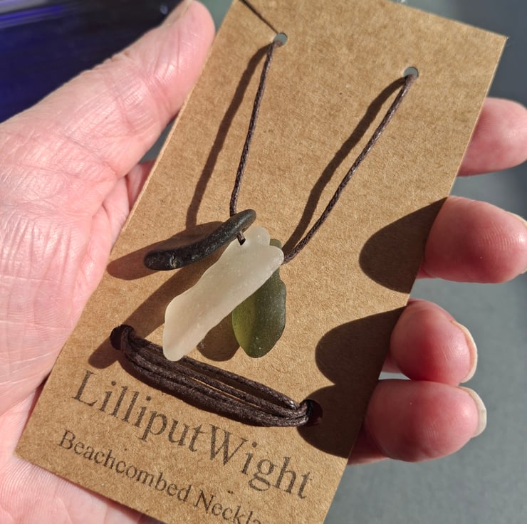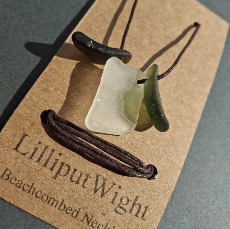 This necklace is made from naturally shaped pieces of sea glass. The sea frosted glass pieces have been suspended from a cord of brown waxed cotton. A pair of sliding knots allow the length of the necklace to be adjustable and yet stay at the desired length.