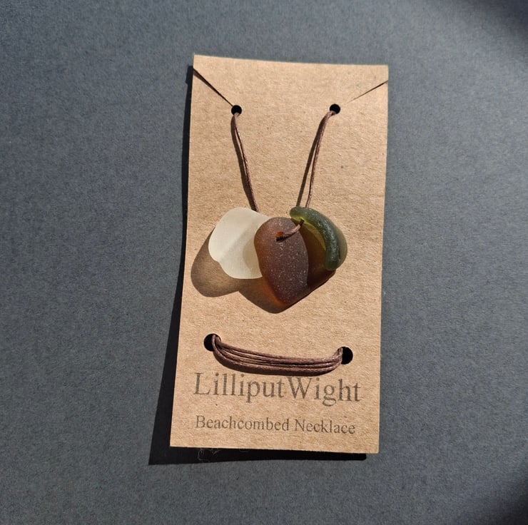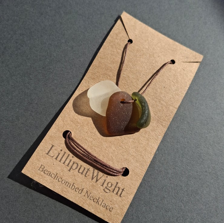 This necklace is made from naturally shaped pieces of sea glass. The sea frosted glass pieces have been suspended from a cord of brown waxed cotton. A pair of sliding knots allow the length of the necklace to be adjustable and yet stay at the desired length.
