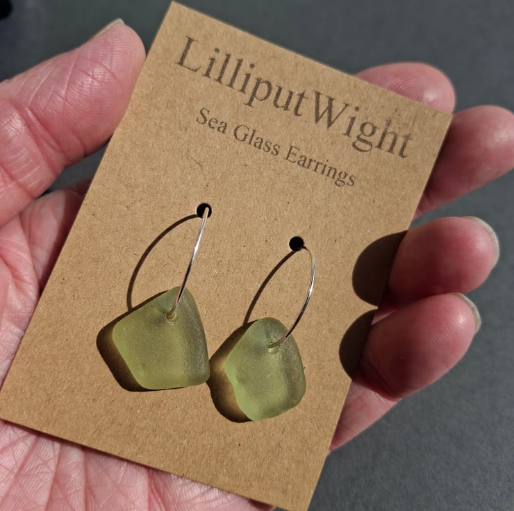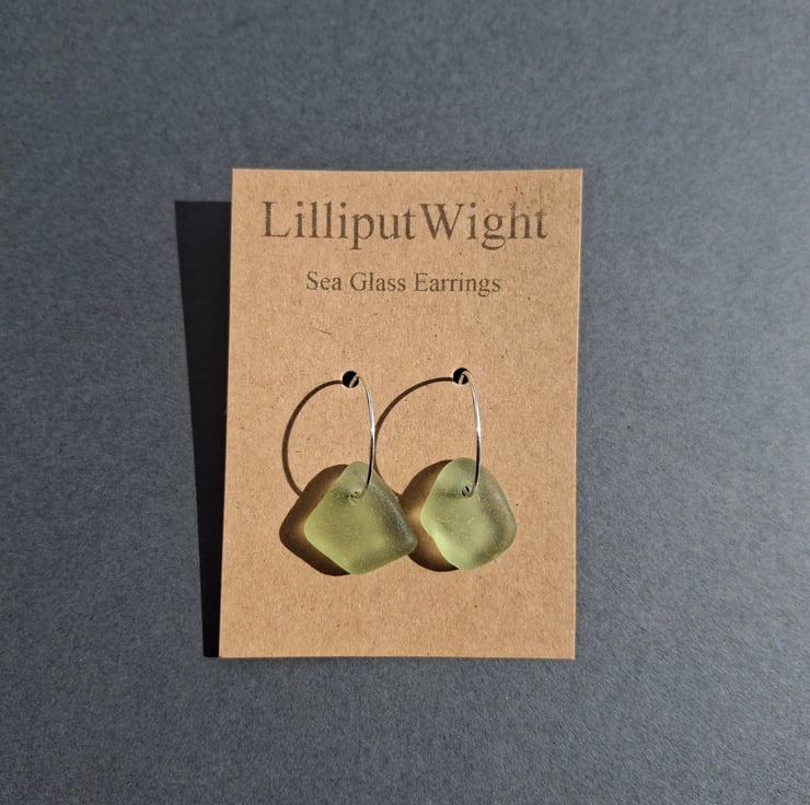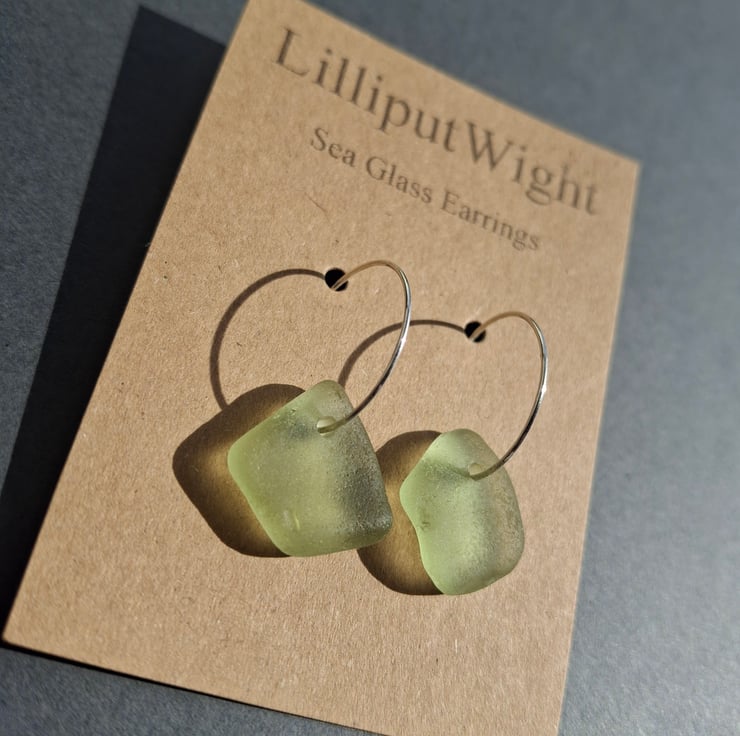 The silver hoops are 3/4" in diameter and each has a piece of sea foam coloured sea glass threaded onto it.