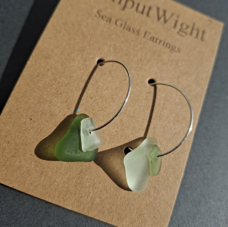 Mismatched sea foam and green coloured sea glass silver hooped earrings