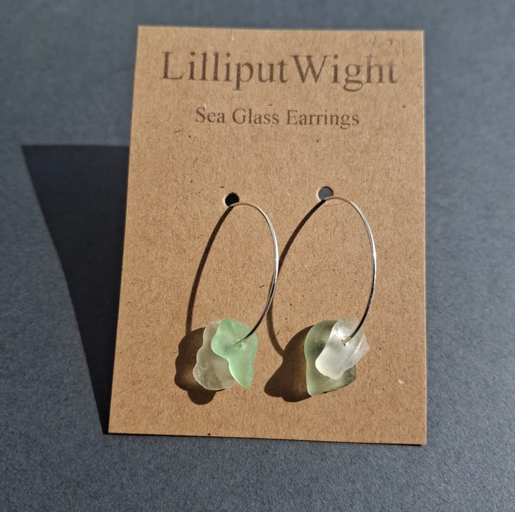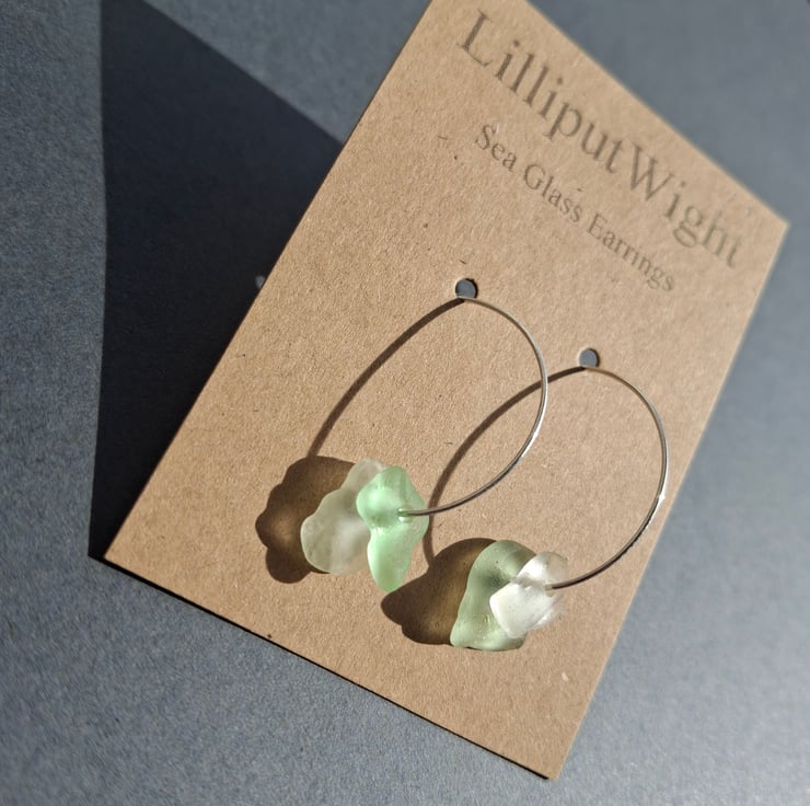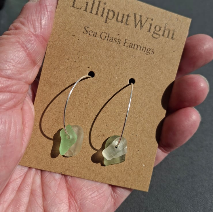 The silver hoops are 1 1/2" in diameter and each has two pieces of sea glass threaded onto it