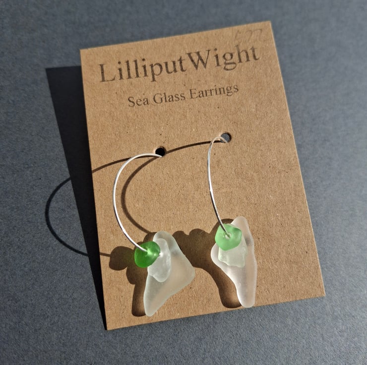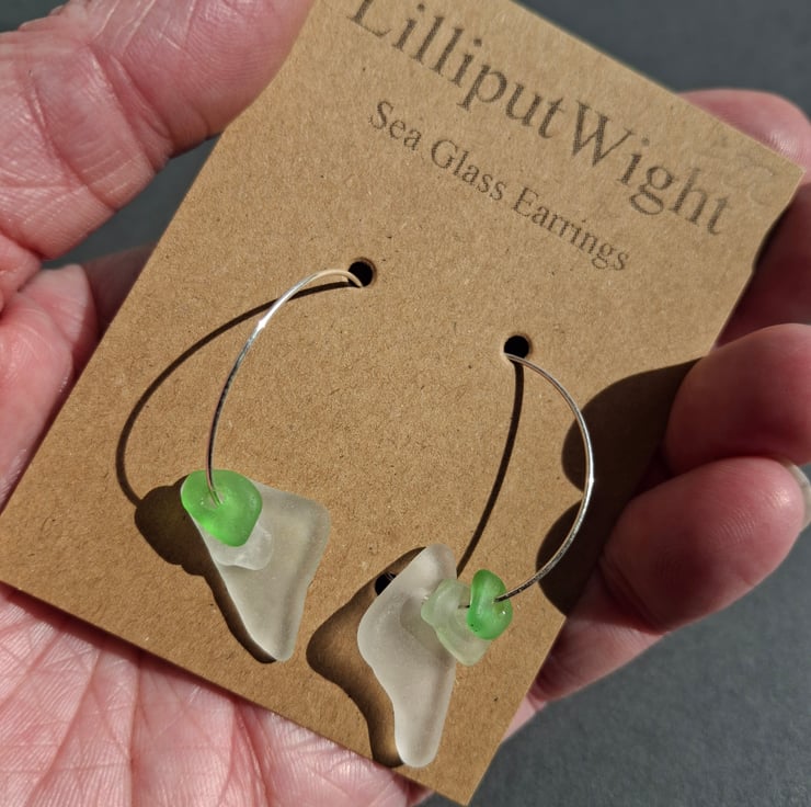 The silver hoops are 1 1/2" in diameter and each has three pieces of sea glass threaded onto it