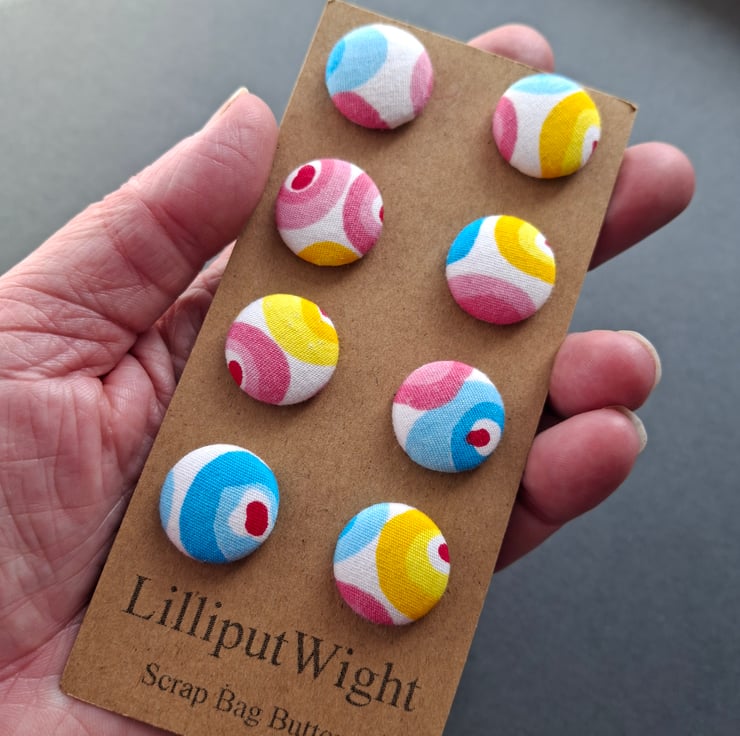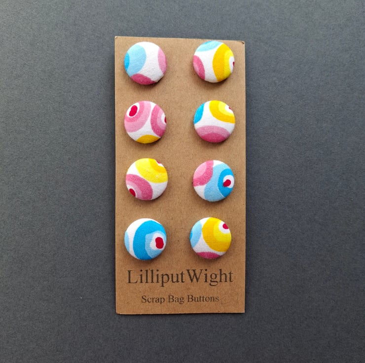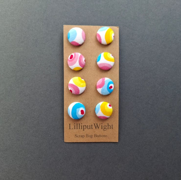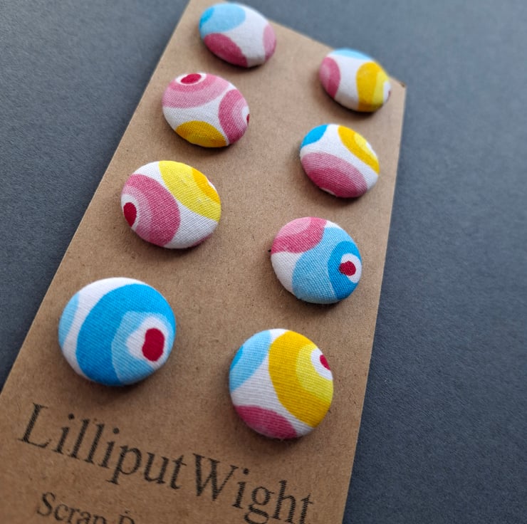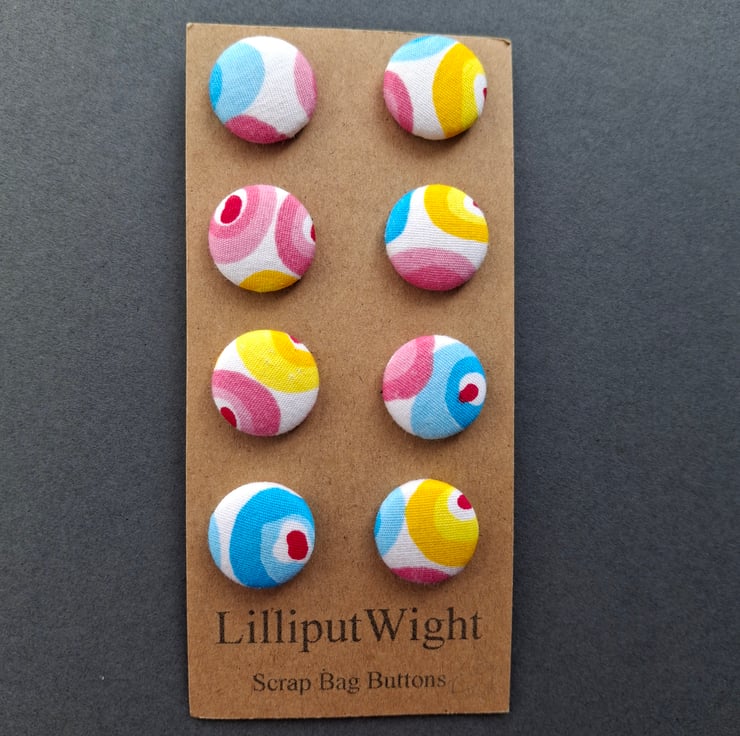 This set of eight buttons are metal buttons covered with scraps of fabric in a pink, blue and yellow design. Each button is around 2cm across.
