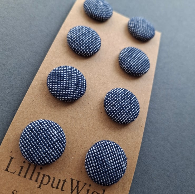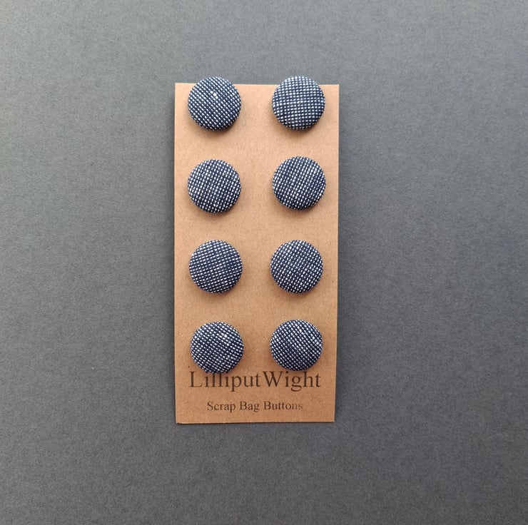 This set of eight buttons are metal buttons covered with scraps of fabric in a dark blue and white weave. Each button is around 2cm across.