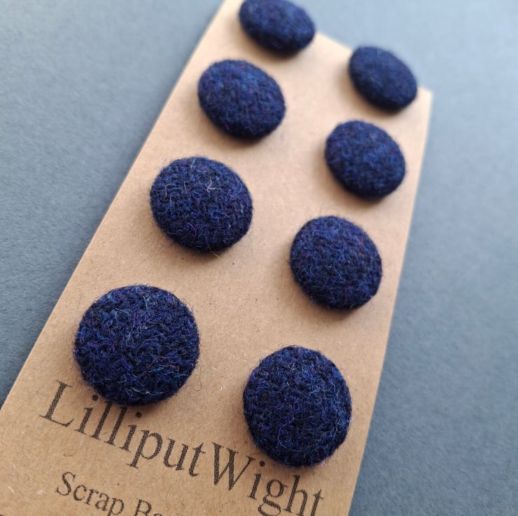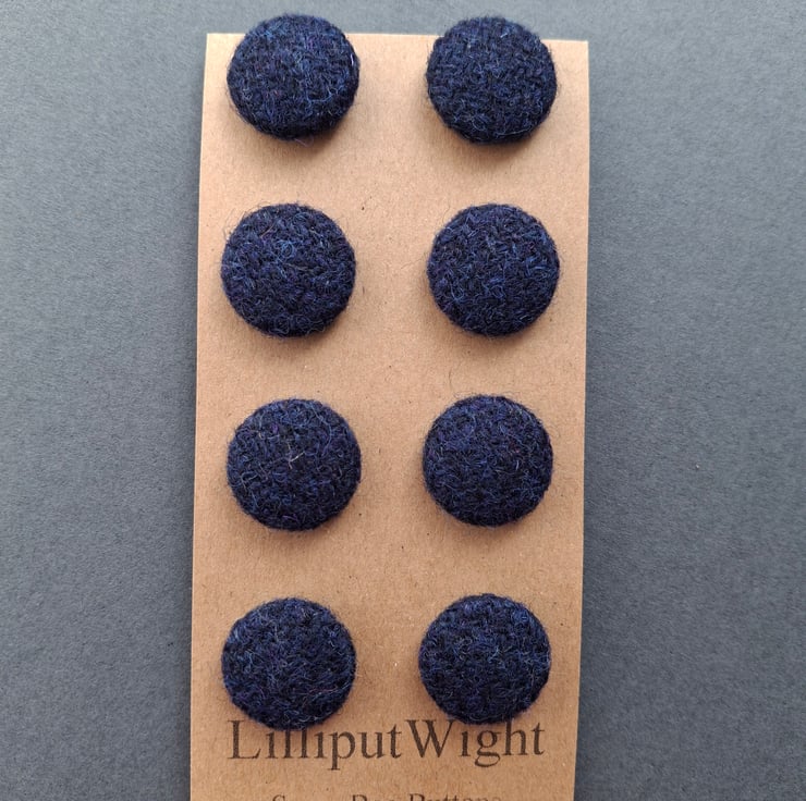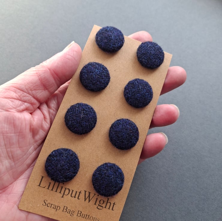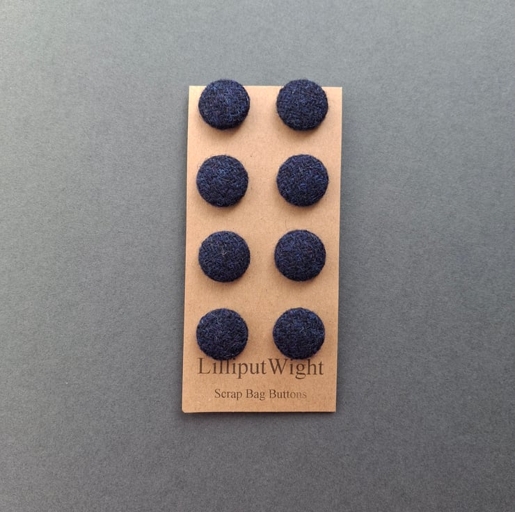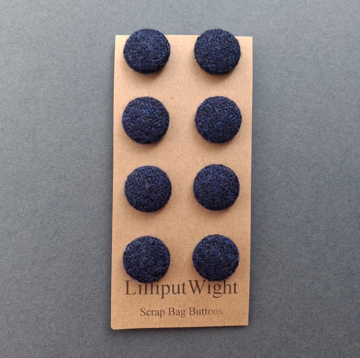 This set of eight buttons are metal buttons covered with scraps of genuine Harris Tweed in a dark blue/navy colour. Each button is around 2cm across.