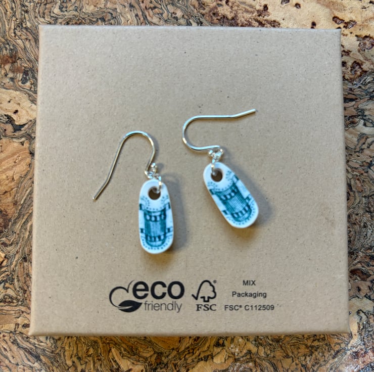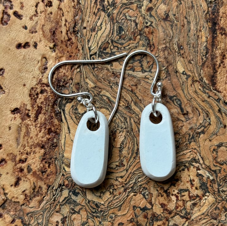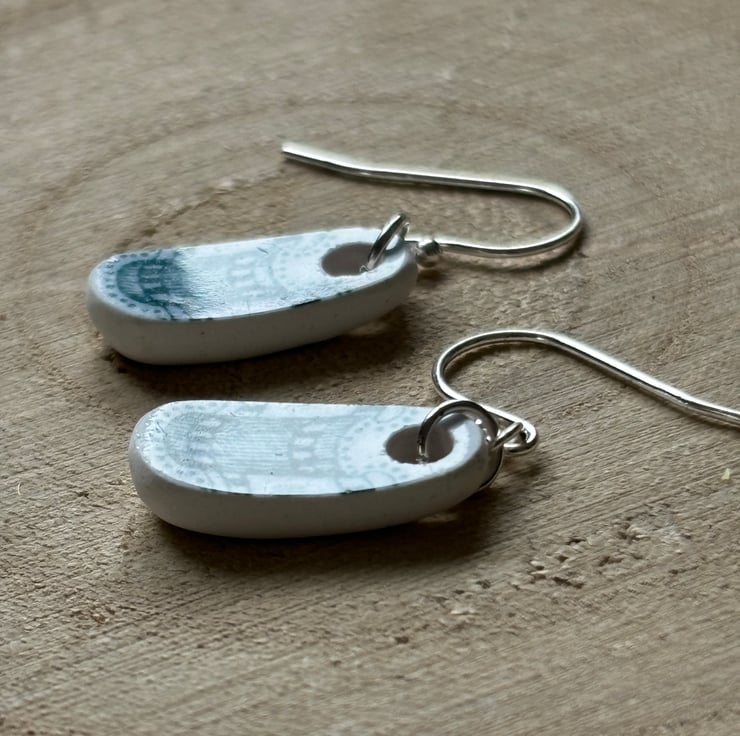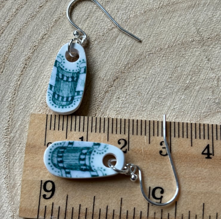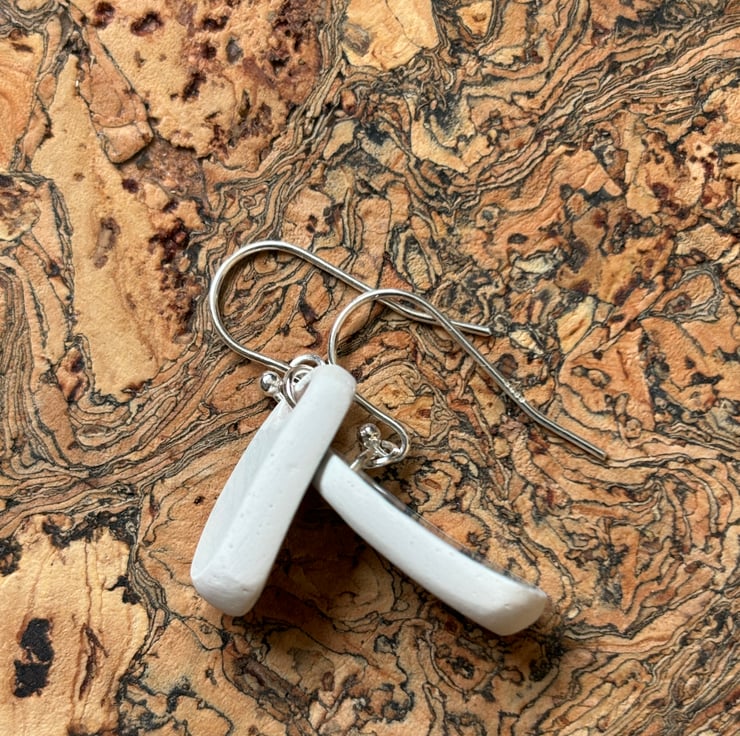After a thorough clean I managed to drill holes and start work. I never plan, just leave it to chance to see what comes from the ceramic. The way the shard broke suggested earrings, there’s a very slight curve at the bottom of the ceramic which adds to the overall unique design.