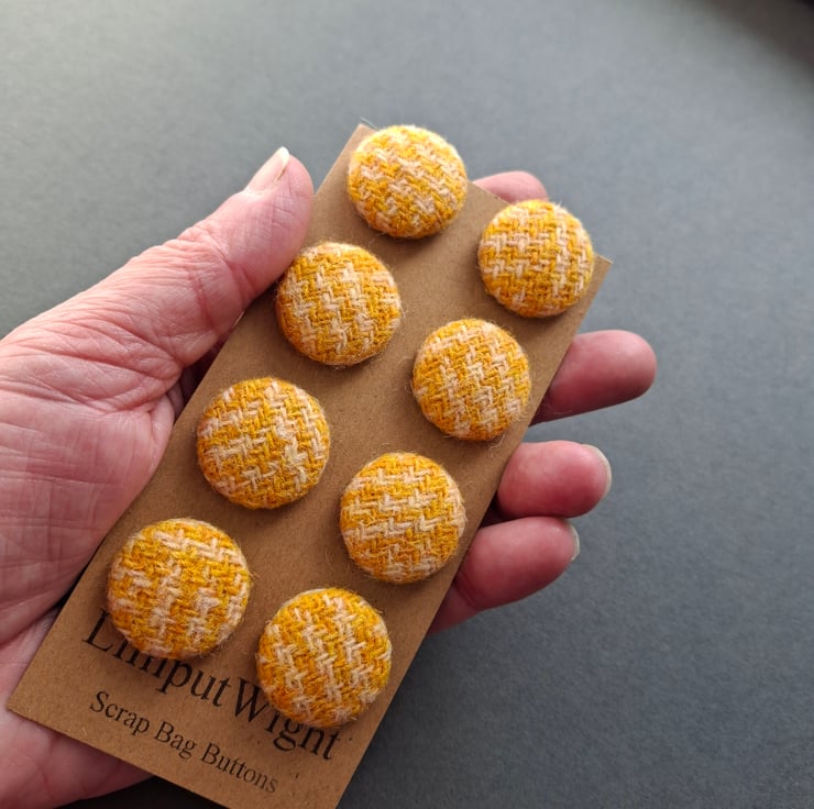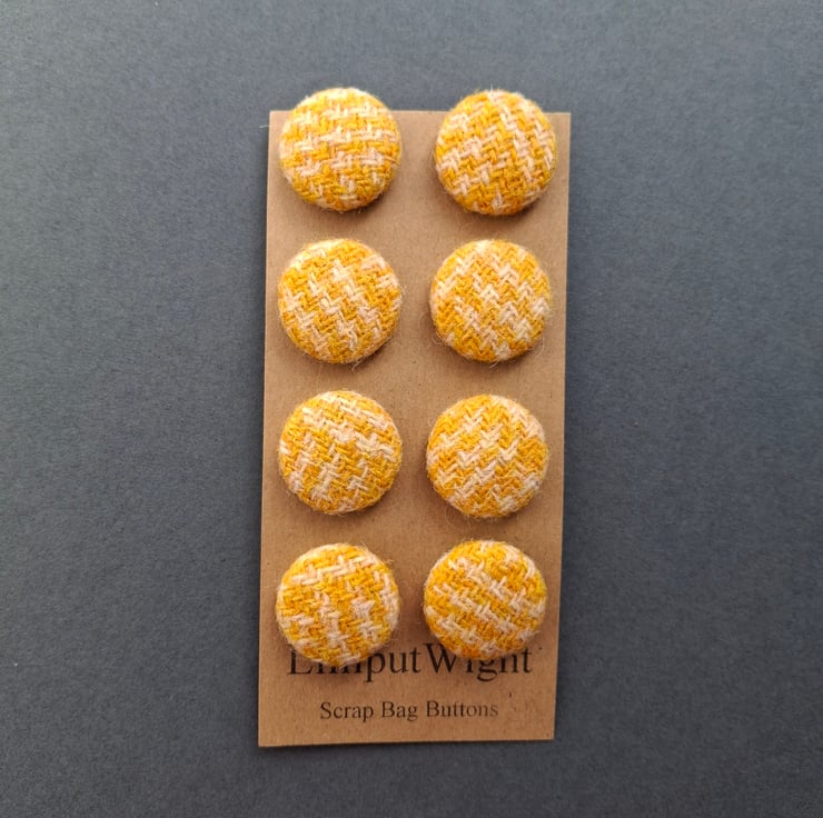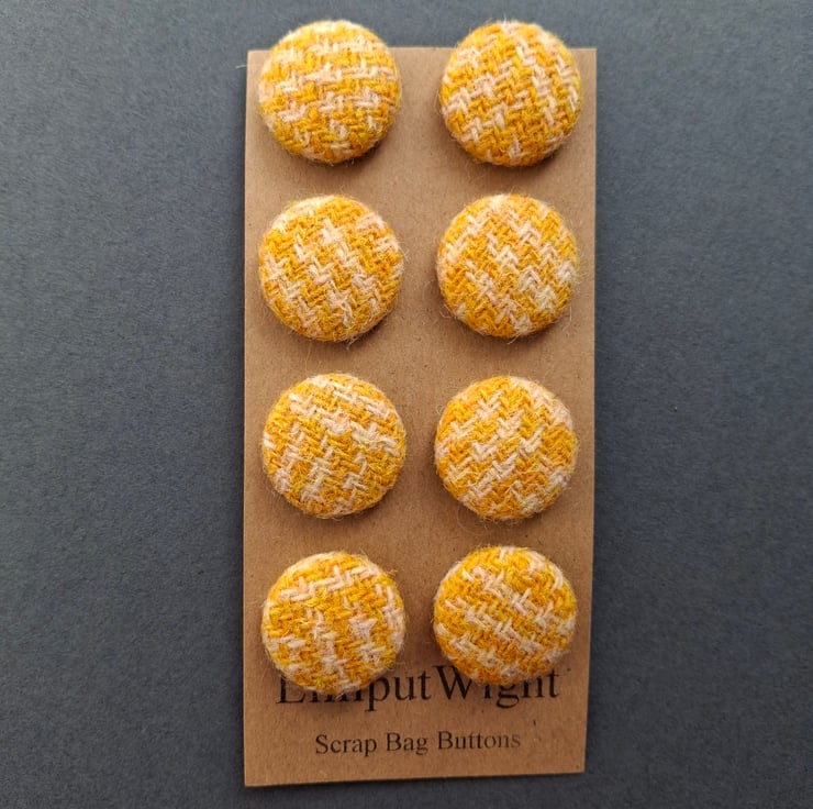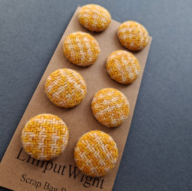 This set of eight buttons are metal buttons covered with scraps of genuine Harris Tweed in mustard and pale yellow. Each button is around 2 1/2cm across.
