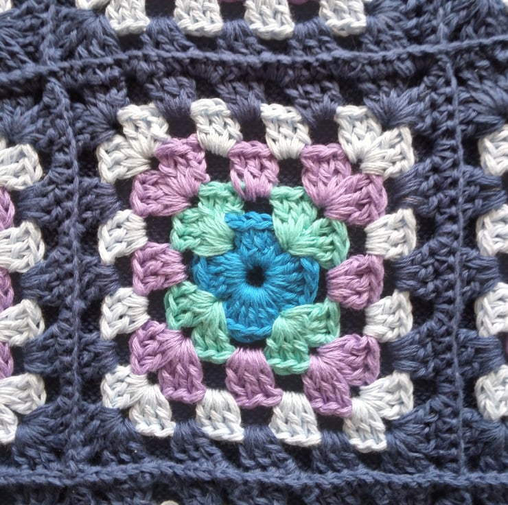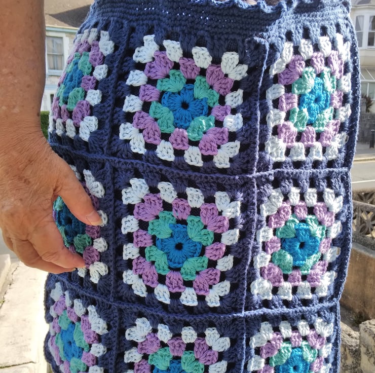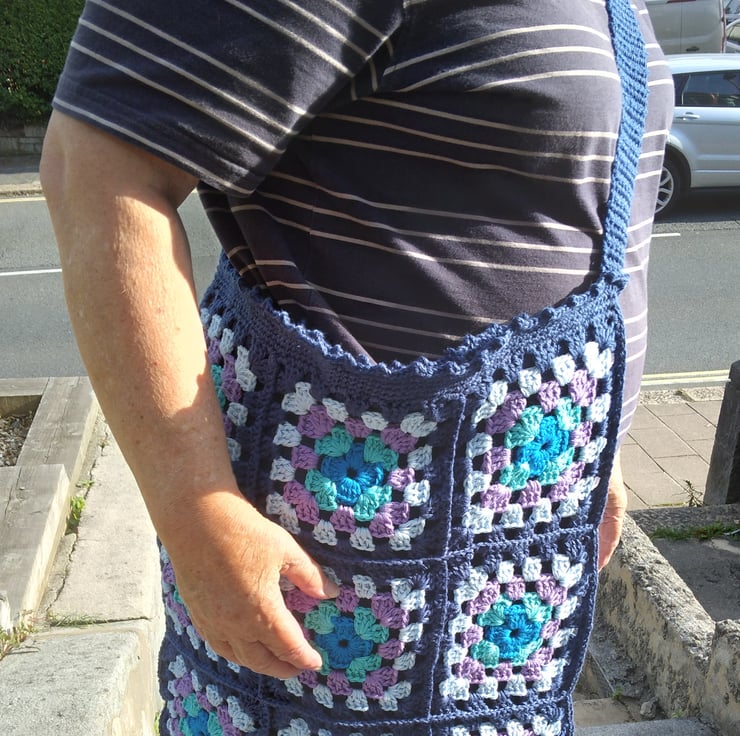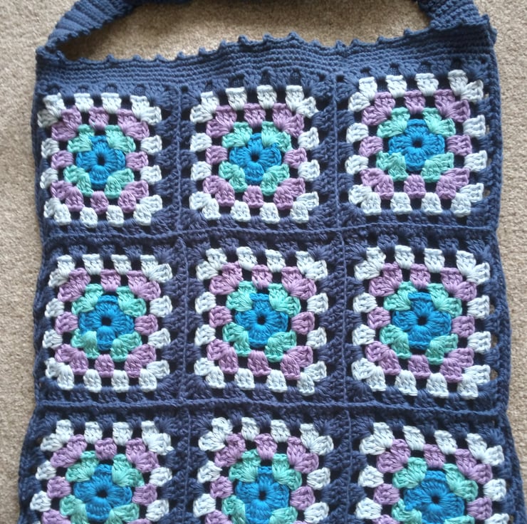 Crochet Crossbody Bag made from Granny Squares and lined with a fine machine knitted lining to stop things falling through the holes. 16 ins (40 cm) square in machine washable cotton.