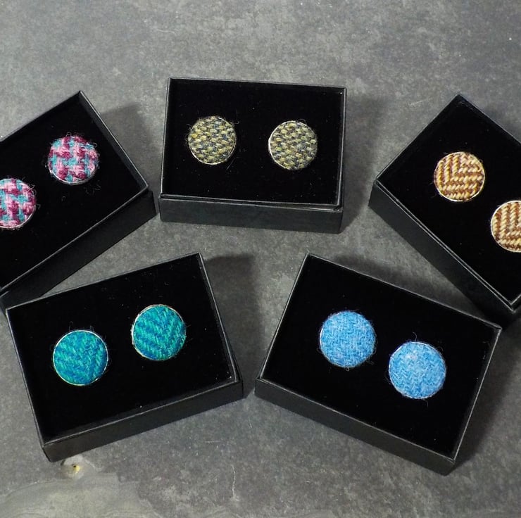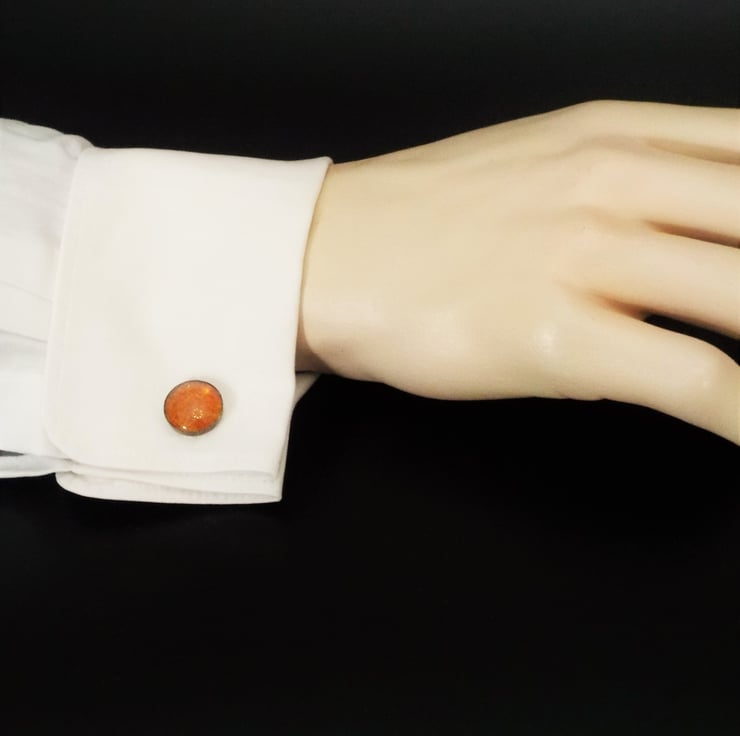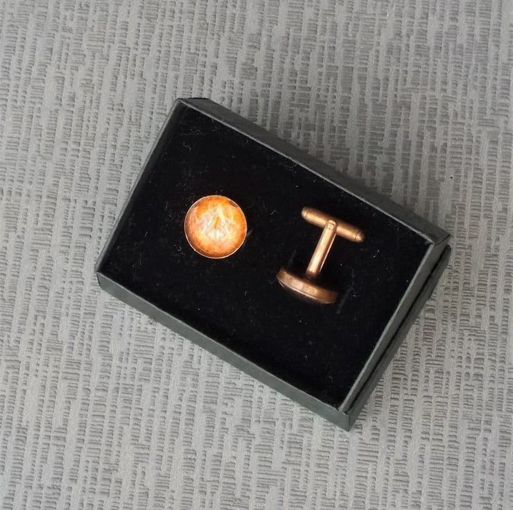 These Harris tweed cufflinks are ideal for that special occasion. I have used plain orange design fabric on a round coppertone metal base, and covered with a glass cabochon. Both beautiful and useful, these cufflinks will be worn and cherished for years to come.