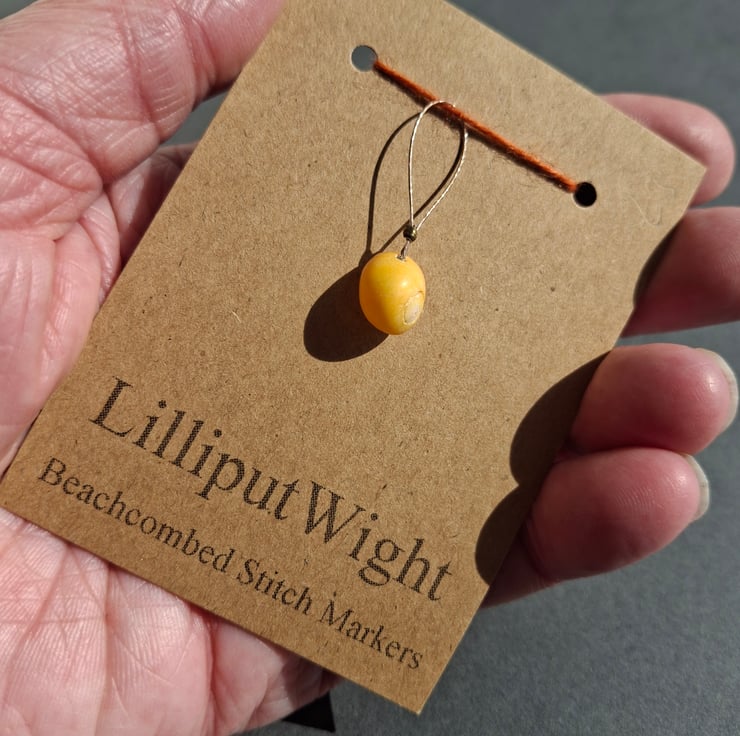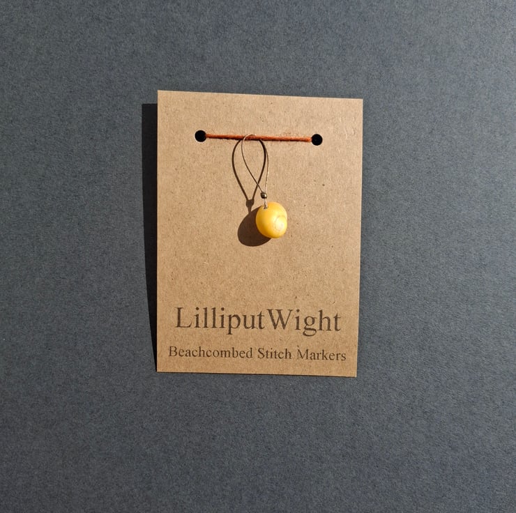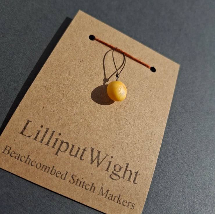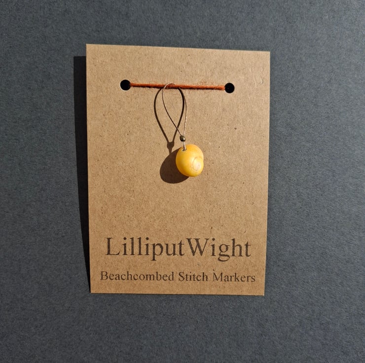 A single snag free stitch marker with a yellow sea snail shell collected from the beaches close to my home on the Isle of Wight