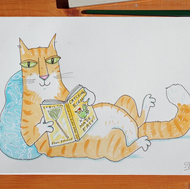 An original pen ink and watercolour illustration of a relaxed cat reading a book.