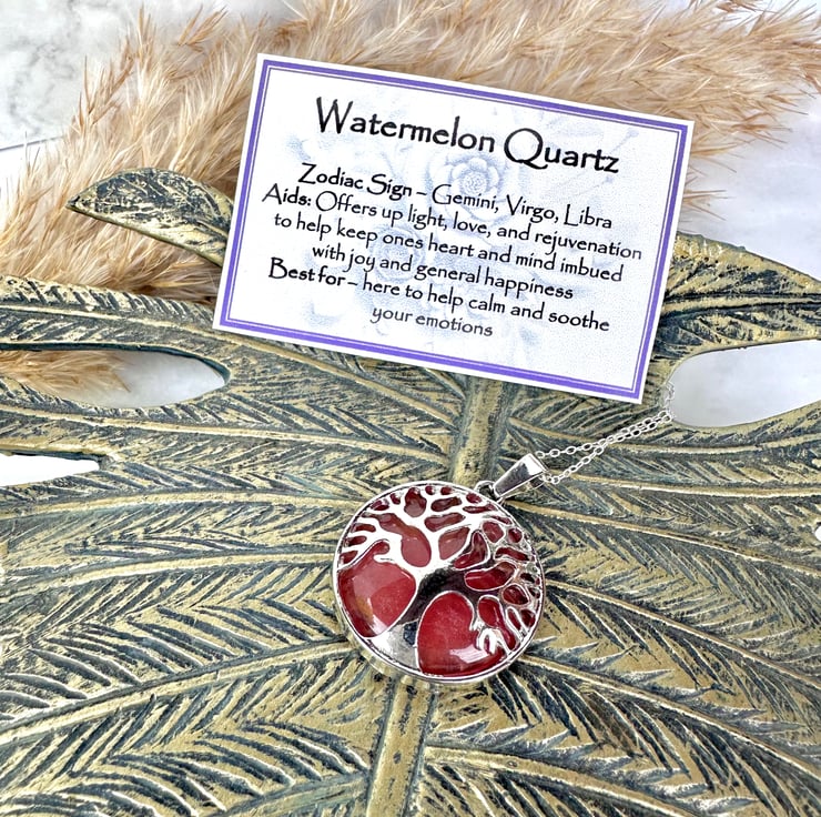 The Watermelon Quartz pendant measures 26mm in diameter and comes complete with a printed card, which gives the properties associated with the Watermelon Quartz crystal. The card also gives the associated zodiac sign, which is unrelated to the specific properties of the stone.