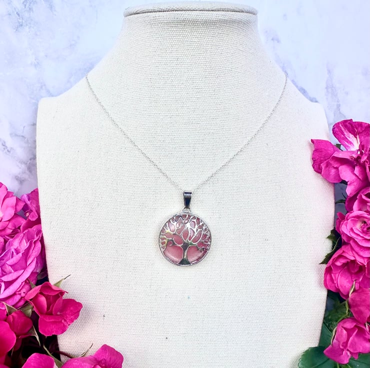 Beautiful and simple, this stunning Watermelon Quartz crystal is set in a silver plated tree of life setting. The pendant is hung on a sterling silver 18" chain.
