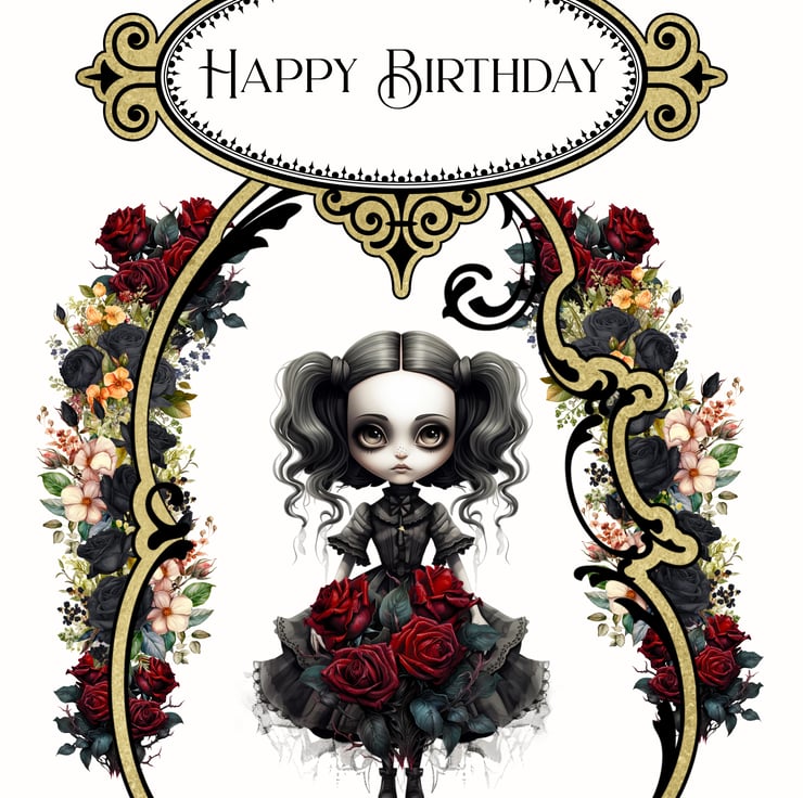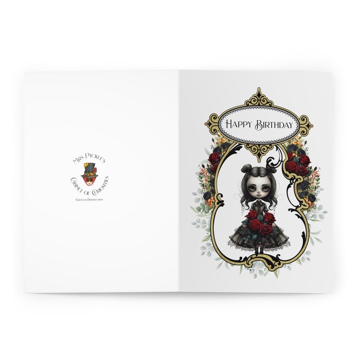 It’s so hard to find greeting cards for our favourite Goths, so this lovely little card aims to save the day! This original design features a little sulking Goth doll, her black curly hair in bunches, in a black Victorian dress. She’s surrounded by an Art Nouveau style border in gold which itself is decorated with bunches of beautiful flowers in peach and red.