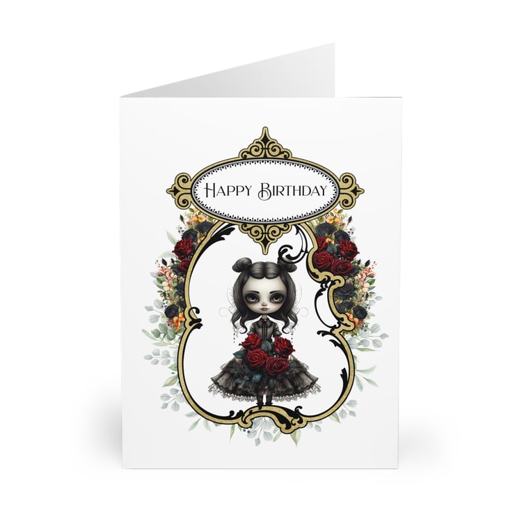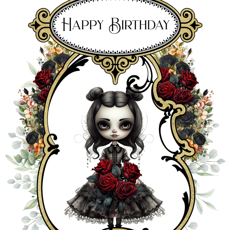 Need something a little different for your favourite Goth friend? This cute little card is here to save the day! This original design features a little sulking Goth doll, her black hair in bunches, in a black Victorian dress. She’s surrounded by an Art Nouveau style border in gold which itself is decorated with bunches of beautiful flowers and leaves.