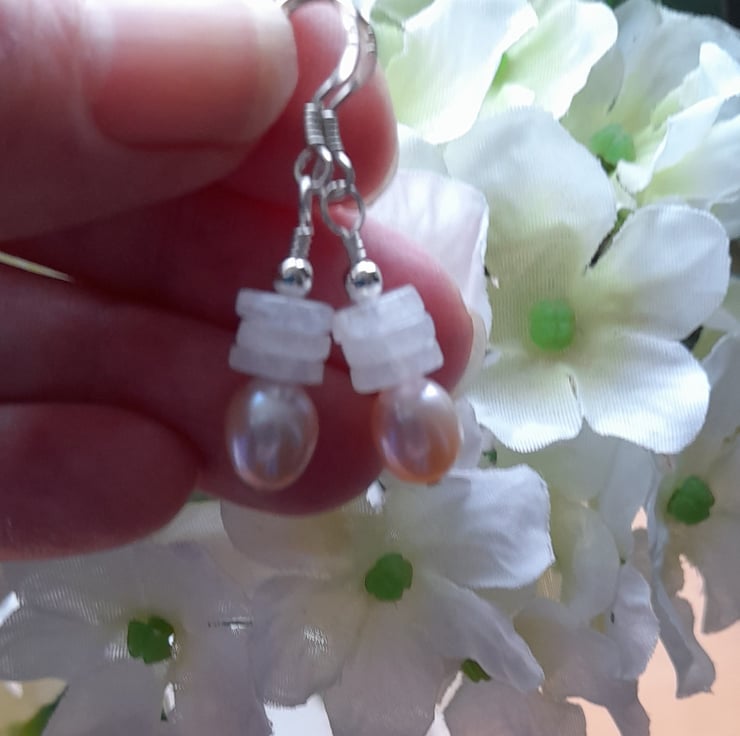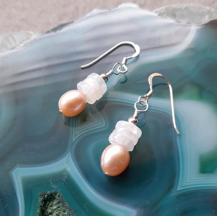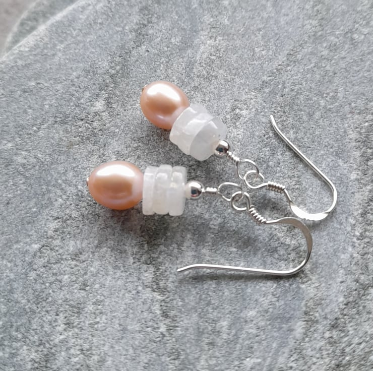 Peach freshwater cultured pearls with moonstone which have blue colours in them as the stone moves in the light, semi precious gemstones are attached to sterling silver ear wires