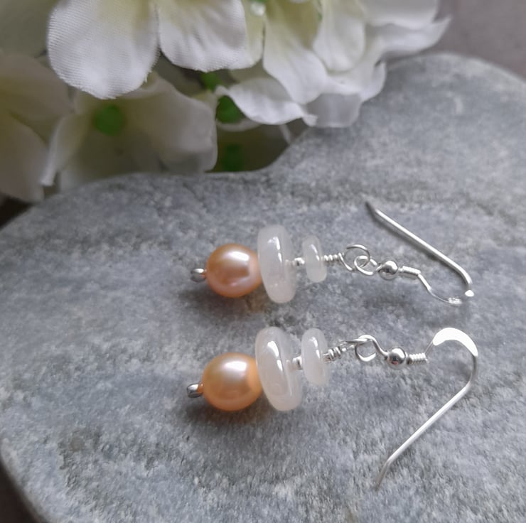 Chalcedony semi precious gemstones which have a pearl coating and peach freshwater cultured pearls are attached to sterling silver ear wires all metals used are 925 sterling silver