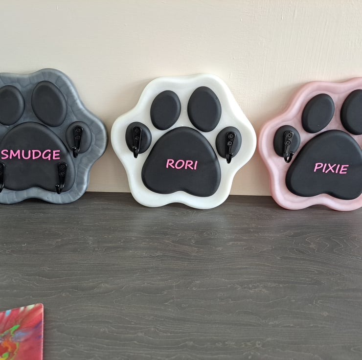 Custom made Resin Dog Leader Board. 2 metal hooks to hang Leaders, Harness, Coats etc. Paw pads are black but the main part can be the colour of your choice, name(s) can be added also in the colour of your choice. 2 brackets on the back make for easy hanging.