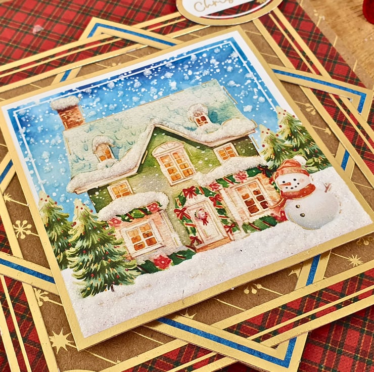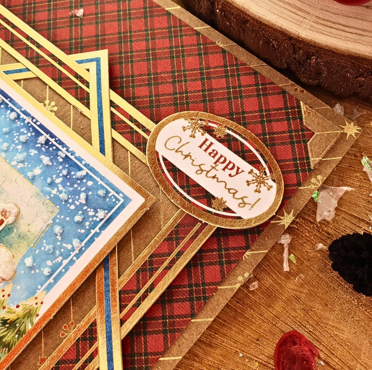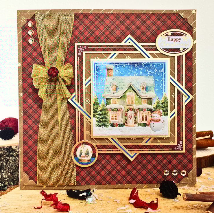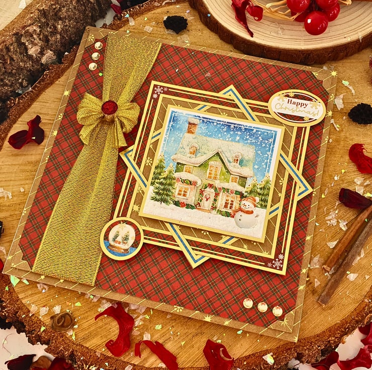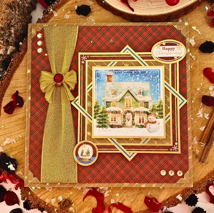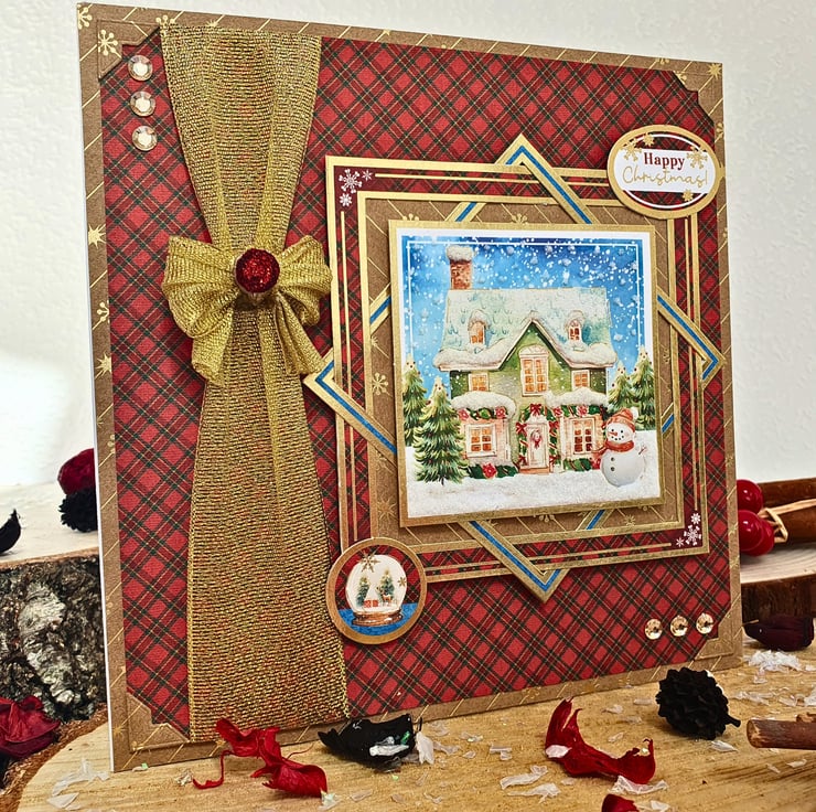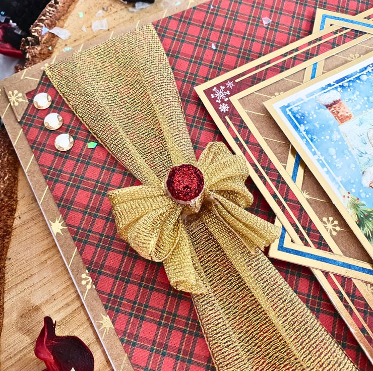 The card consists of mats & layers of gold foiled Kraft card & luxury cardstock printed with a red tartan pattern. On the left side, a glorious gold ribbon bow will catch your eye straight away, while leading you smoothly to the main topper with the snowy landscape, standing on framed panels & raised for dimension. The sentiment reads "Happy Christmas". The card is embellished with gold diamante & white glitter accents that represent the snow. It is finished with coordinating inserts, stamped with the message "Happy Christmas" in red. It is bordered with matching, decorative photo corners.