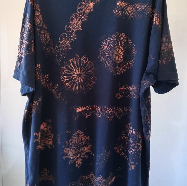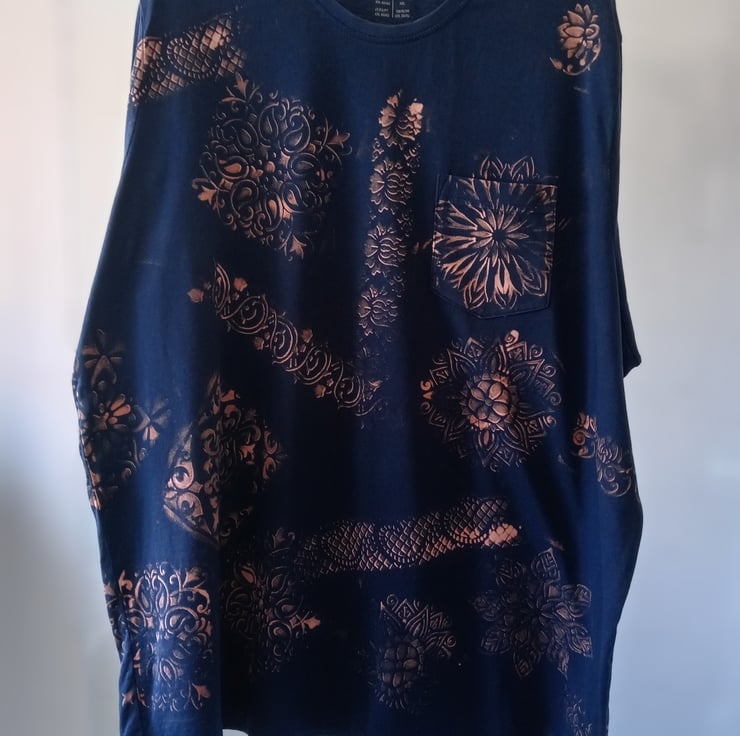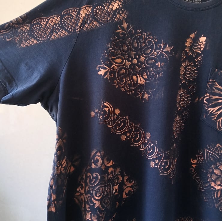 Unisex reverse Tie Dye (bleach work) t-shirt. Completely unique done using bleach and stencils to give the colour fade effect.