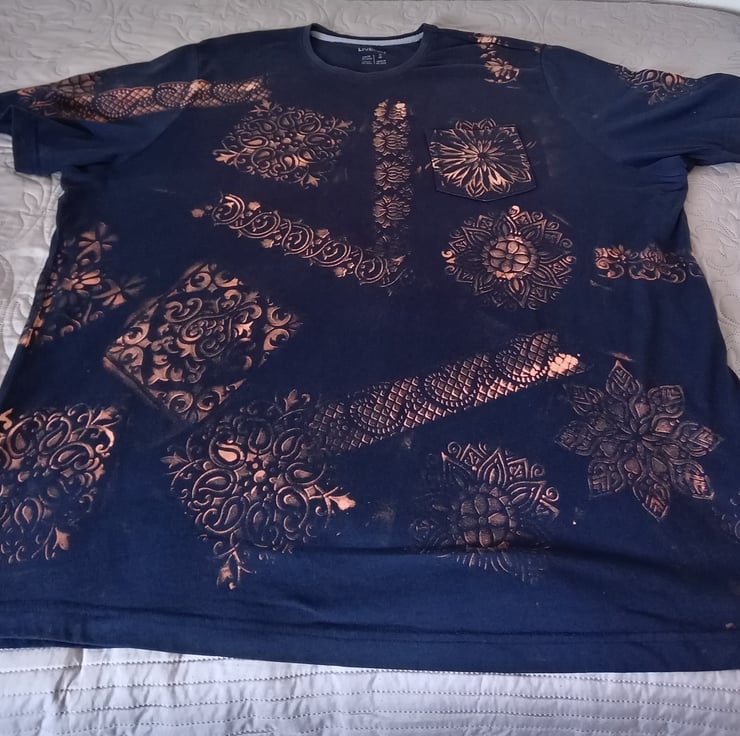 This is a navy blue base and the bleach work is a pink/beige colour it is a 2XL size t-shirt. It's 100% cotton.