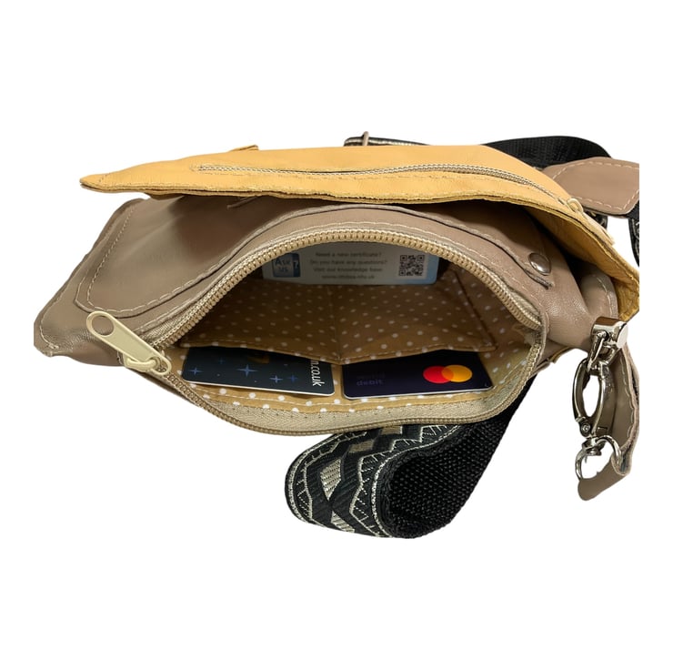 The larger internal compartment that is accessed by the side zip, is fully lined in beige with white polka dots cotton and has 2 credit card slots. On the outside flap is an unlined zip pocket, under this is another unlined slip pocket with a smaller pocket on top. On the back is another slip pocket, again unlined. The strong wide black nylon heavyweight webbing strap is made as a feature by adding pretty colour coordinated jacquard ribbon sewn on the top, this is fully detachable, it clips onto the 2 screw on buckles with 2 swivel lanyard clips.