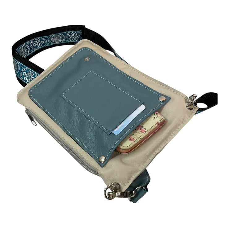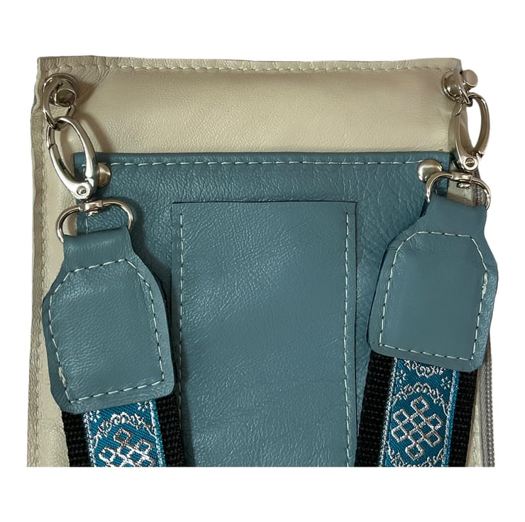 The larger internal compartment that is accessed by the side zip, is fully lined in turquoise with white polka dots cotton and has 2 credit card slots. On the outside flap is an unlined zip pocket, under this is another unlined slip pocket with a smaller pocket on top. On the back is another slip pocket, again unlined. The strong wide black nylon heavyweight webbing strap is made as a feature by adding pretty colour coordinated jacquard ribbon sewn on the top, this is fully detachable, it clips onto the 2 screw on buckles with 2 swivel lanyard clips.