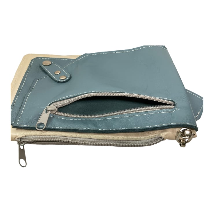 Made in soft and supple lambs leather in 2 shades - cream and smoky blue. This handy bag is slim so sits close to your body, and will hold the basics when you want to grab a small bag for a trip out. The style is ‘raw edged’ so the leather has been cut and sewn together as is.