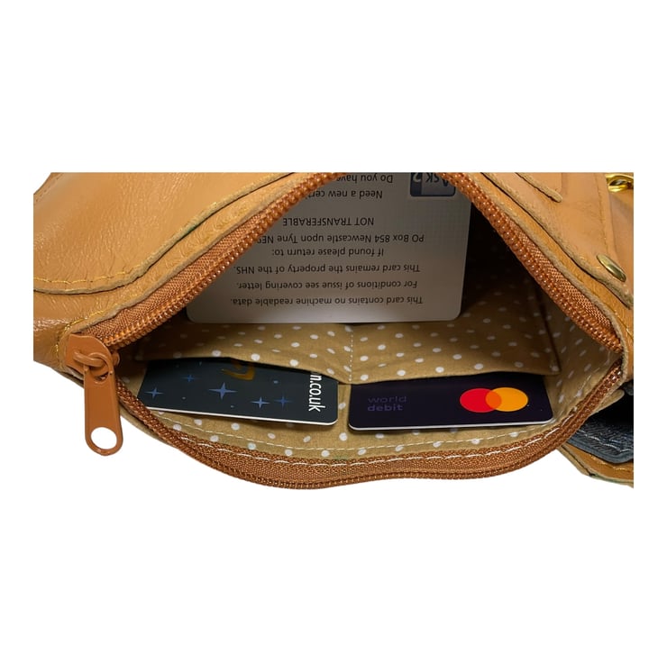 The larger internal compartment that is accessed by the side zip, is fully lined in turquoise with white polka dots cotton and has 2 credit card slots. On the outside flap is an unlined zip pocket, under this is another unlined slip pocket with a smaller pocket on top. On the back is another slip pocket, again unlined. The strong wide black nylon heavyweight webbing strap is made as a feature by adding pretty colour coordinated jacquard ribbon sewn on the top, this is fully detachable, it clips onto the 2 screw on buckles with 2 swivel lanyard clips.