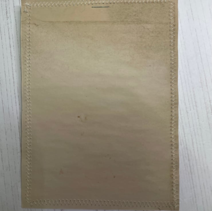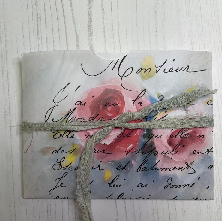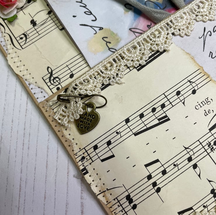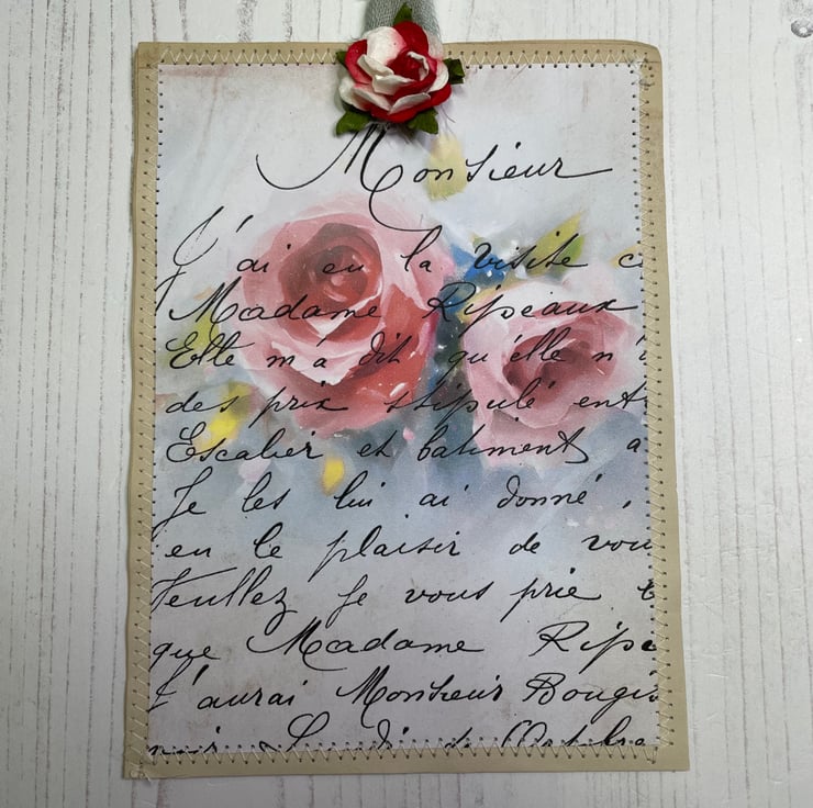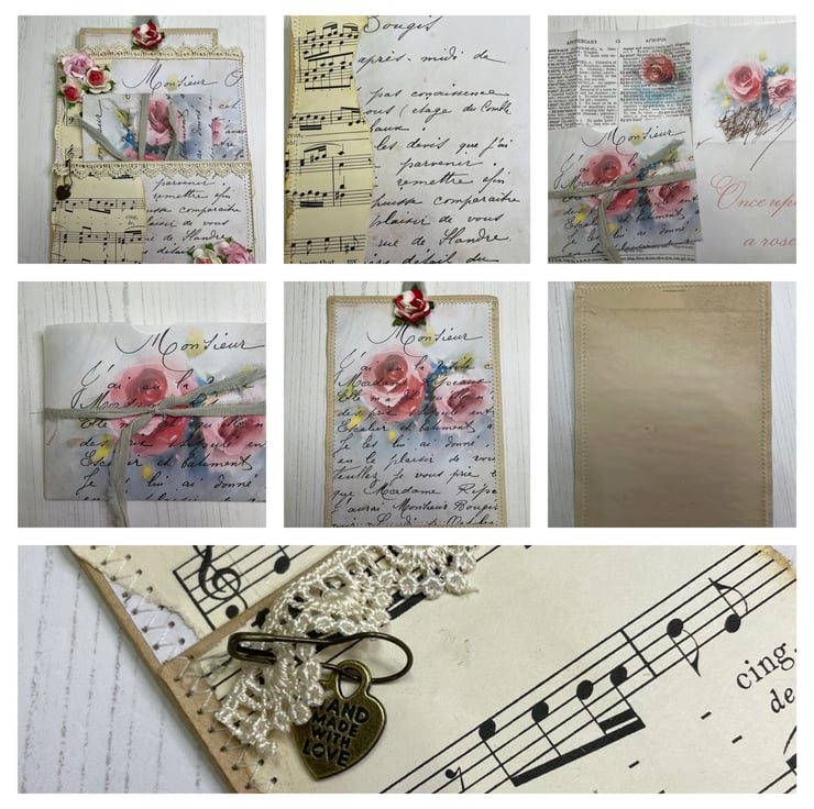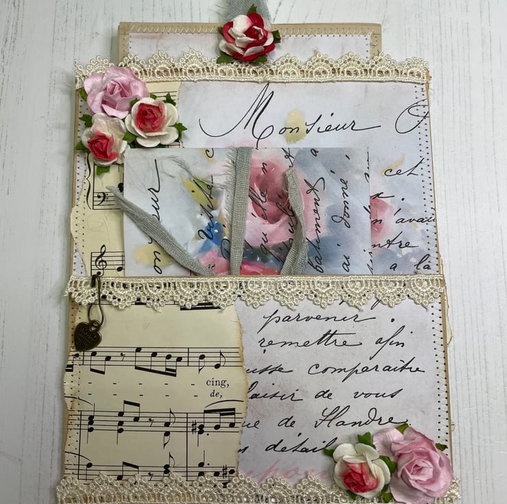 Autumn blessings is the name of this delightful paper. Made into a double pocket, the base is a paper bag, covered in a sheet of the pretty paper plus addition of a torn vintage music score. Lace added to the front lower pocket and across the top of the bag. Stitched on my sewing machine. Roses added as embellishments and a heart charm on a bulb pin. The front pocket holds an envelope slip pocket with a sheet of dictionary words and a letter. Tag to top pocket backed with coffee stained paper and a rose. Measures 6” x 7”