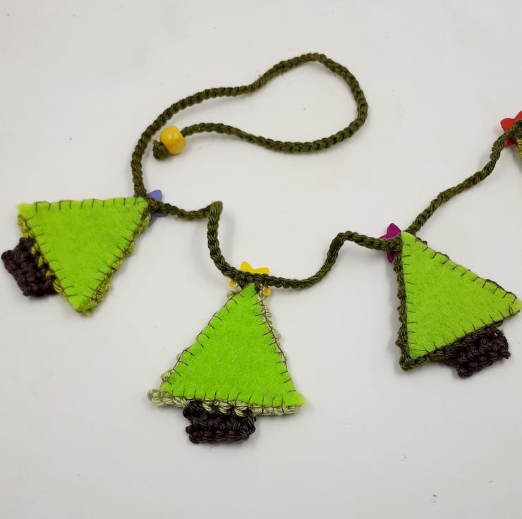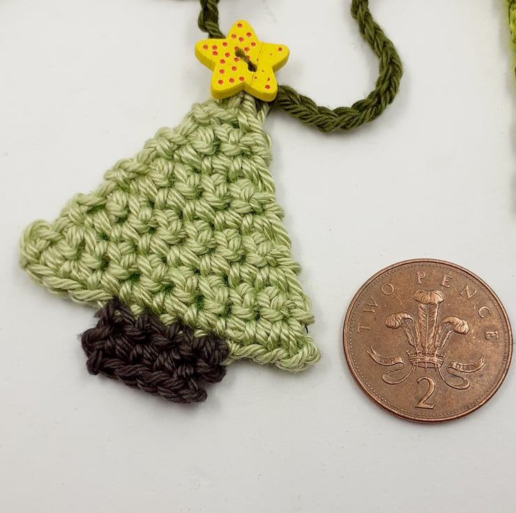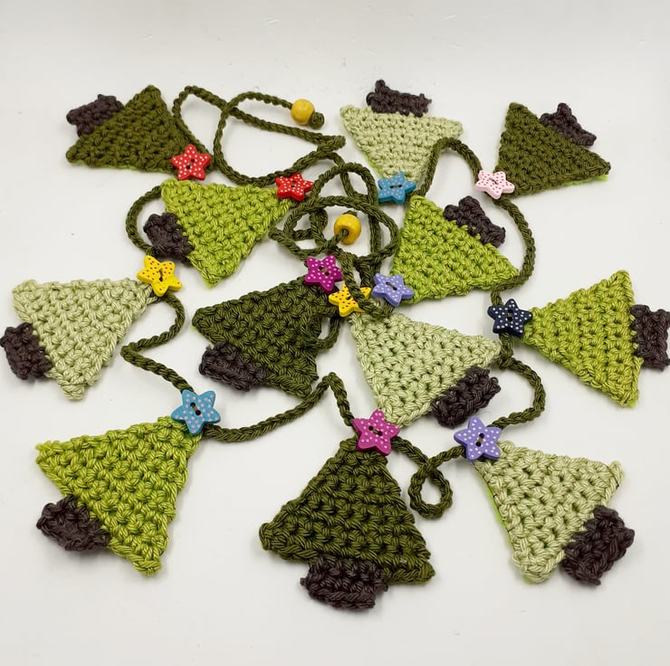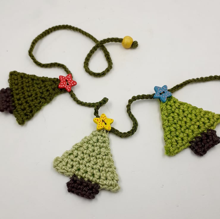 This pretty garland is crocheted in cotton and each of the 12 little trees is topped with a painted wooden star button. The trees are backed in stiffened felt and the ends of the 'string' are finished with painted wooden beads for easy tying. The whole garland measures approximately 140cm and comes wrapped in tissue in a labelled PIP (Postage in Proportion) box all ready to be given or posted on.