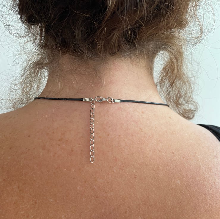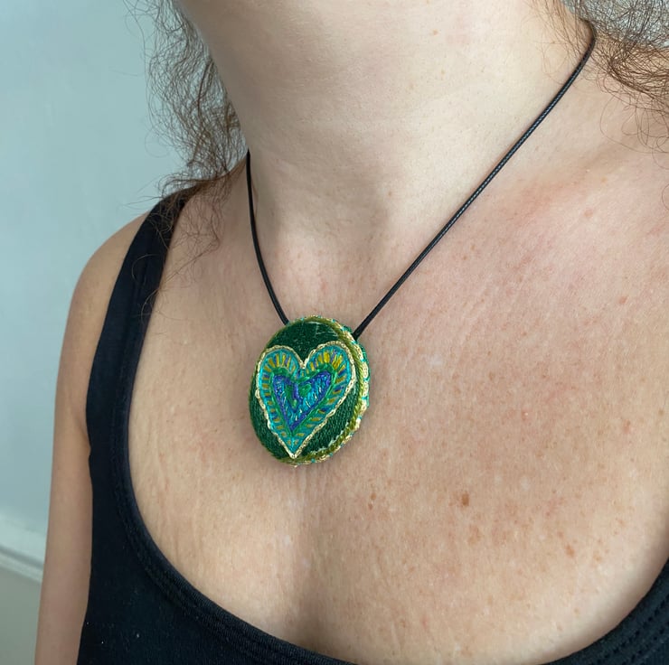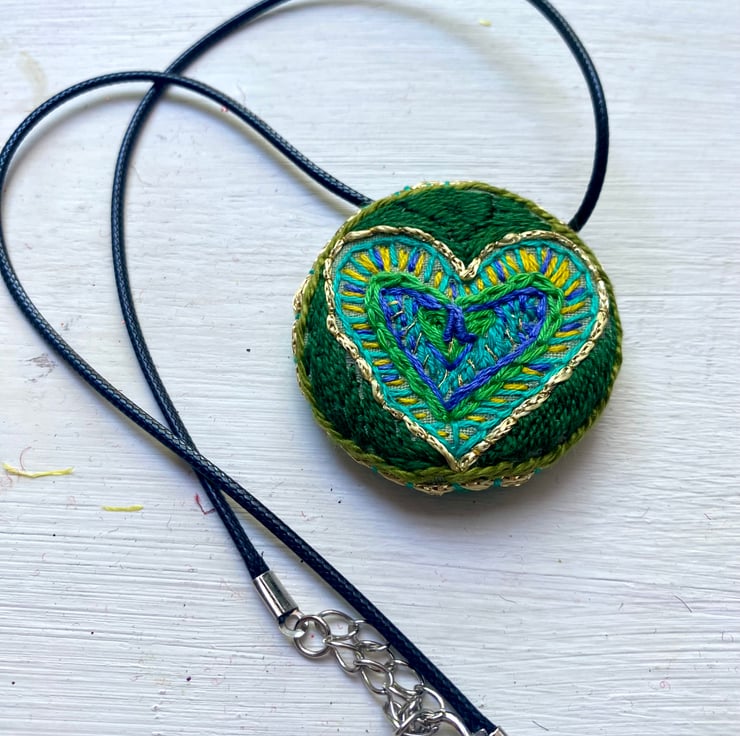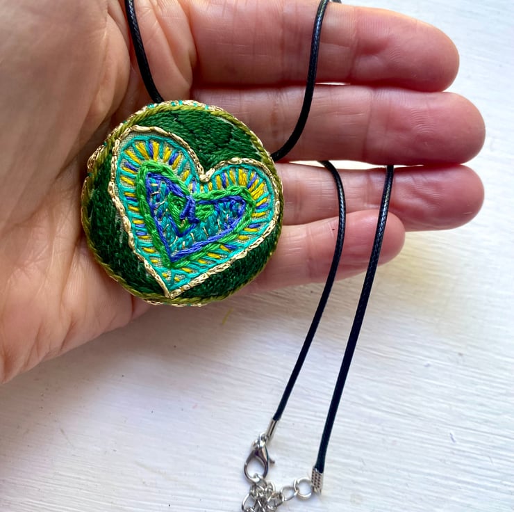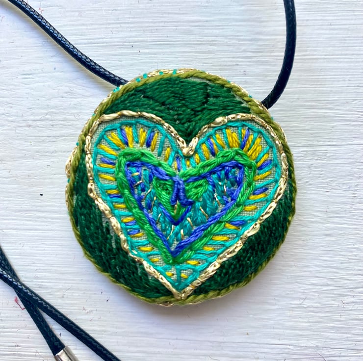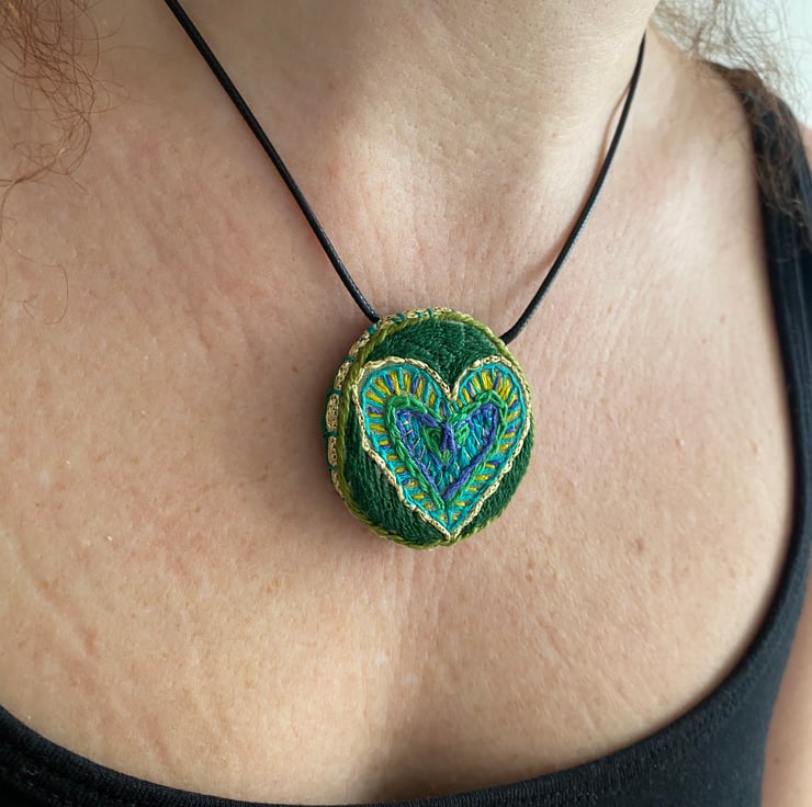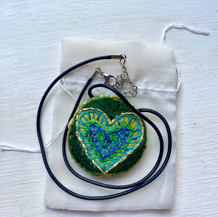 Hand stitched in rich colours this pendant makes a beautiful token of love for a special friend or relative. It’s made with love for the environment incorporating reclaimed fabric and vintage threads. The 1.5 inch diameter pendant hangs just below the collar bone on a 17 inch adjustable clamp fastening cord and comes in a voile pouch.
