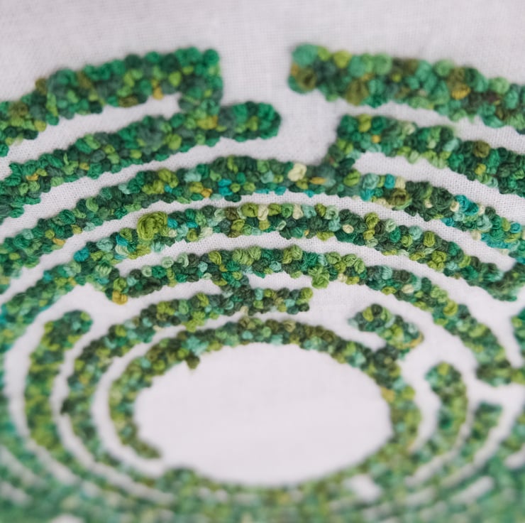The maze is made up of multiple shades of green embroidery thread and the pattern created with French knot technique.