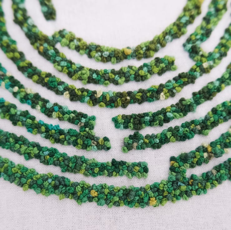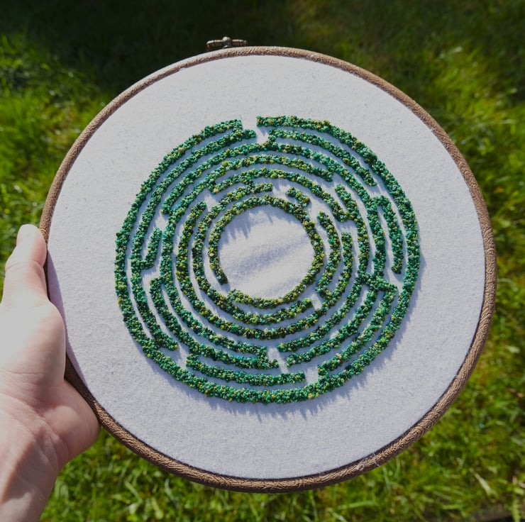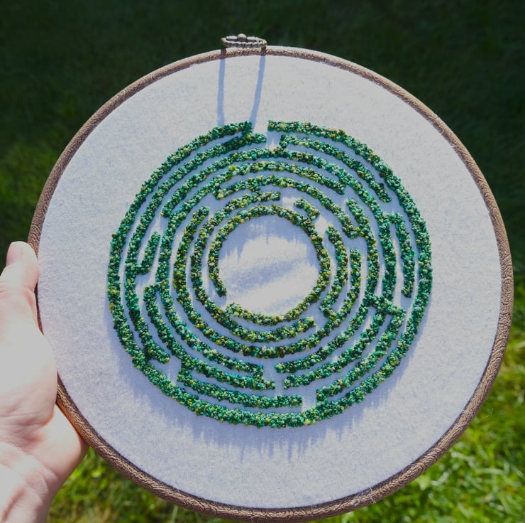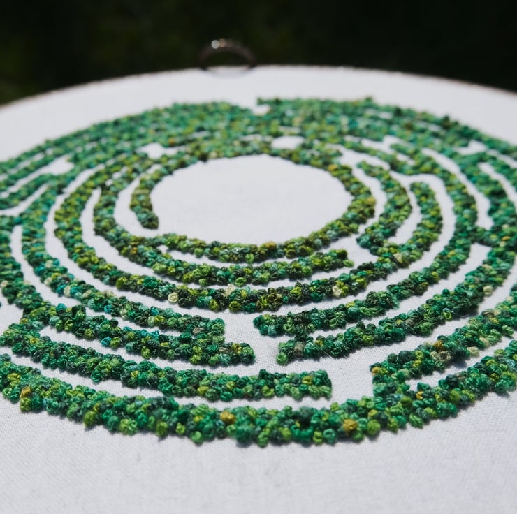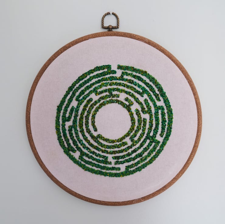 The maze is made up of multiple shades of green embroidery thread and the pattern created with French knot technique.