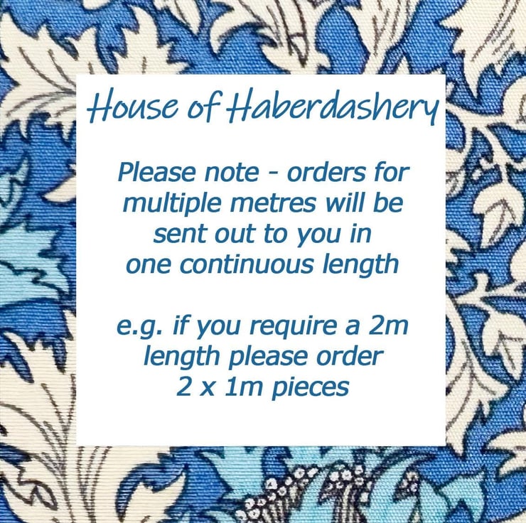 This listing is for 12 Metre or 1 Metre length of fabric. Multiples of lengths purchased will be sent as a continuous length where possible.