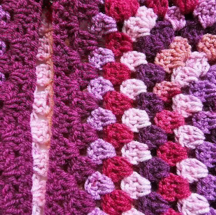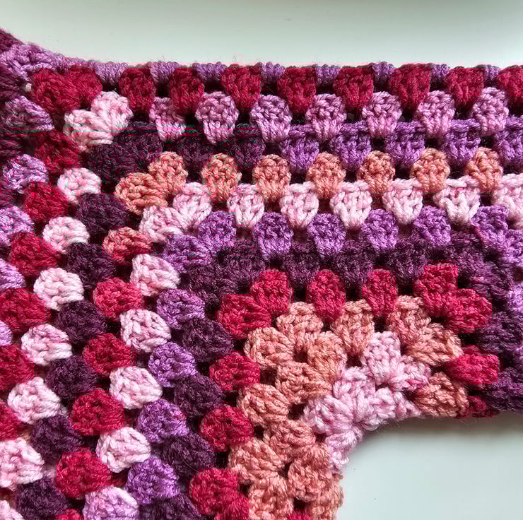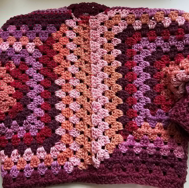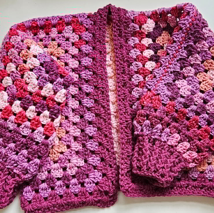 This handmade cardigan is the latest trend in crochet clothes. It's crocheted using the granny stitch in a yarn which is self striping with gorgeous, rich purples and pinks.