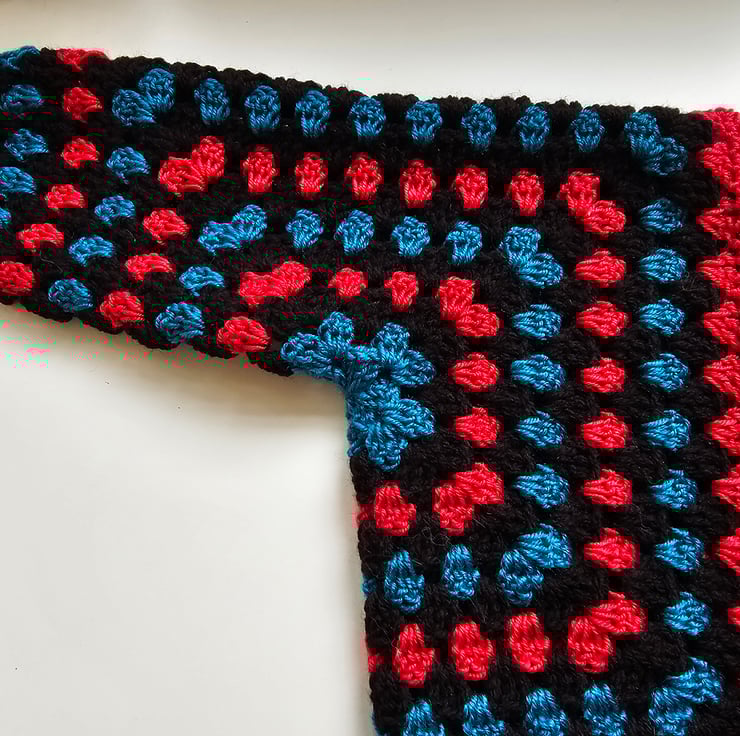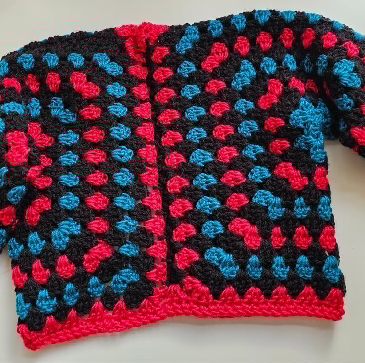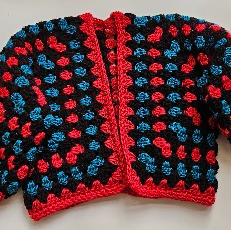 This handmade cardigan is the latest trend in crochet clothes. It's crocheted using the granny stitch in black, red and teal yarn.