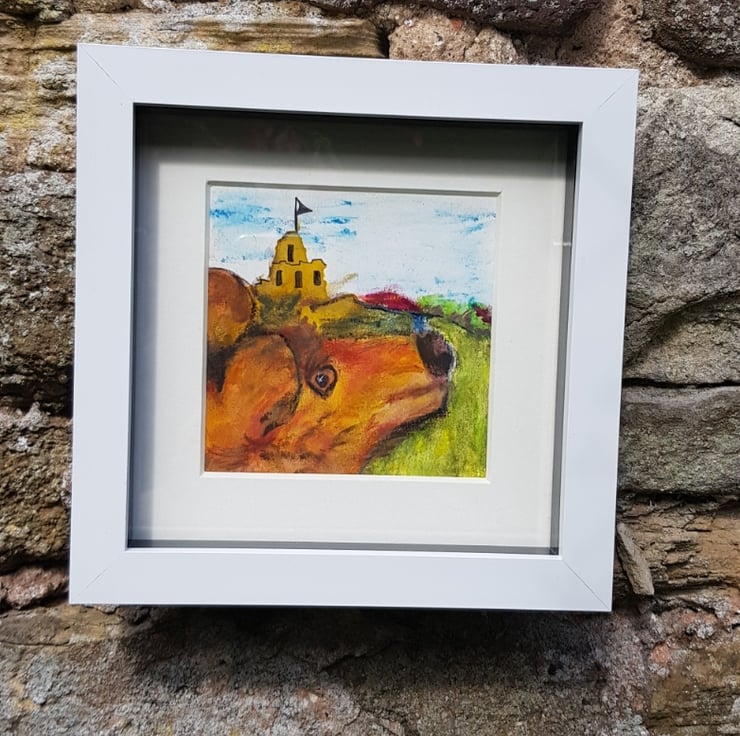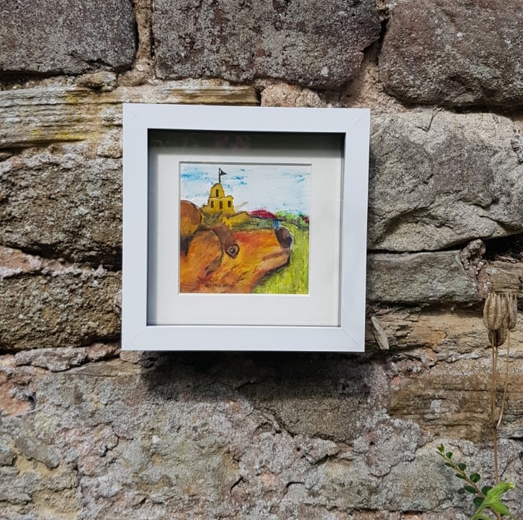 The art piece measures 4" x 4" in a white frame with mount measuring 7"x7" approx. The frame is able to be hung or it has a back stand to stand on a shelf.