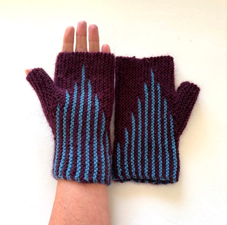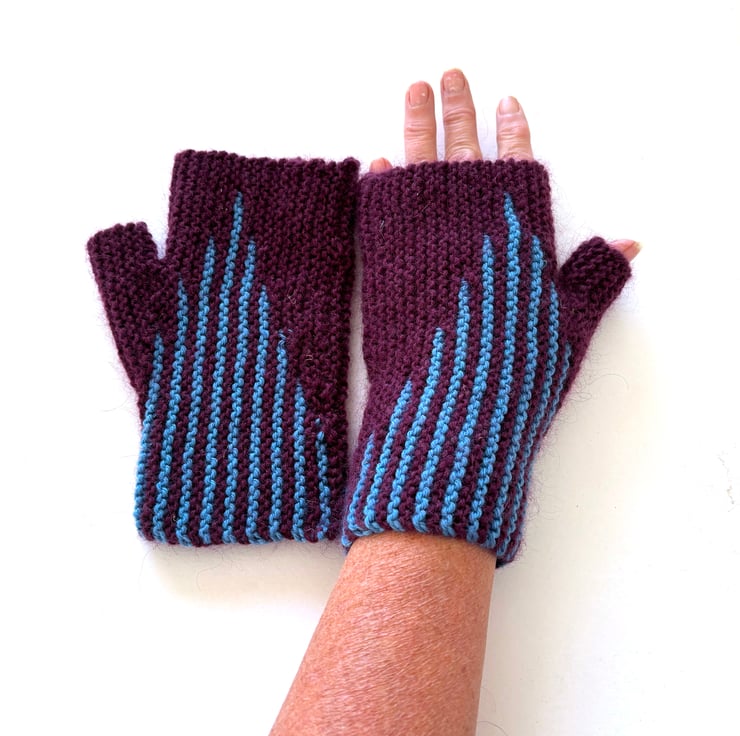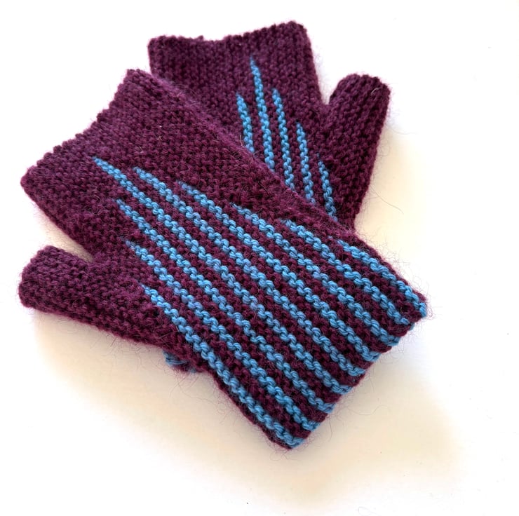 Trendy knitted gloves, knitted sideways with contrasting stripes on the front and back of each glove. Lovely warm hand knitted gloves. These cozy glovess are knit in a 100% wool yarn in purple with the blue stripes knitted in a acrlic/wool mix yarn. Will fit a medium sized ladies hand.