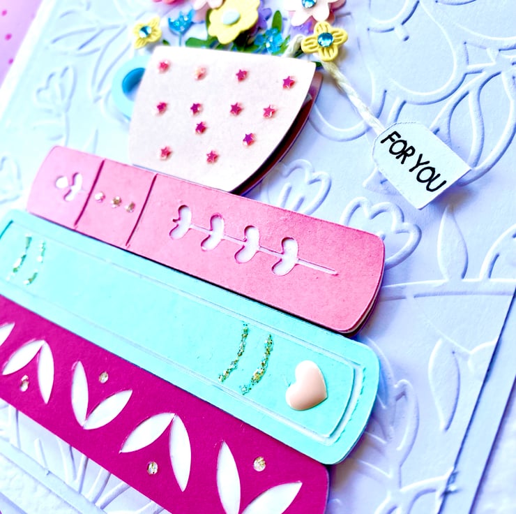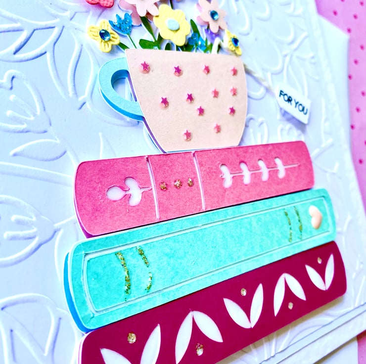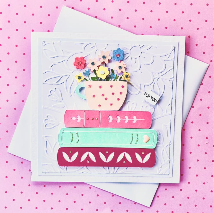 This multi layer birthday card measures approximately 6x6 inches. It has a floral book theme. It has glossy accents, glitter and mini stars for that extra bit of sparkle.