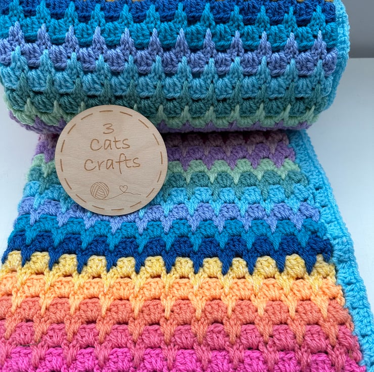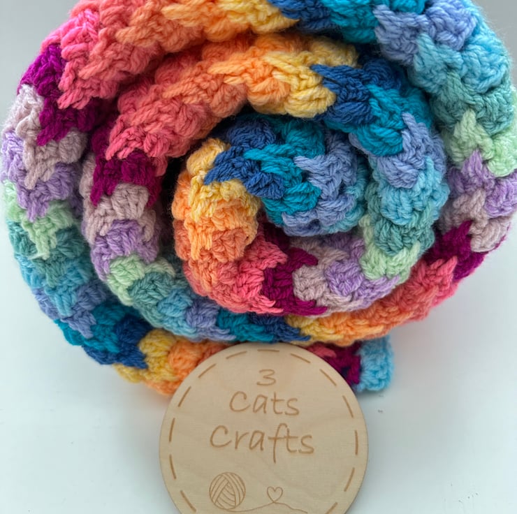 Gorgeous crochet blanket, handmade by me. Pretty pastel shades but still super colourful. This is a lovely squishy and warm blanket! 118 by 129cm. Very generous lap blanket, or it could go on top of a single bed (but it won't overhang or be the full length). Quality acrylic dk yarn.