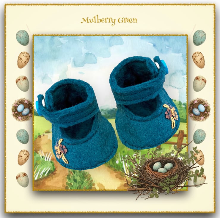 Pretty little embroidered teal shoes, to fit the Mulberry Green dolls.