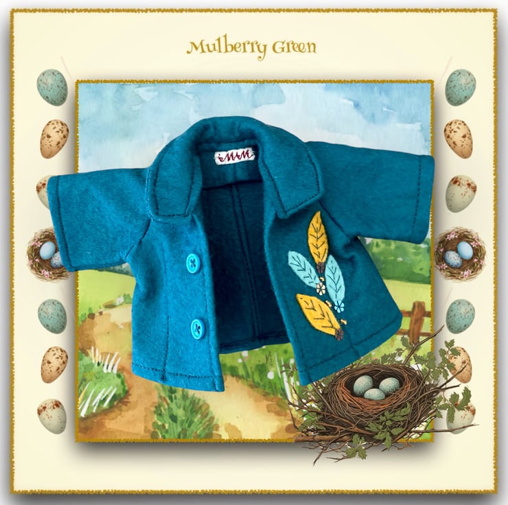 A beautiful little teal felt jacket, to fit the Mulberry Green dolls. The jacket is embroidered with sequinned leaves.