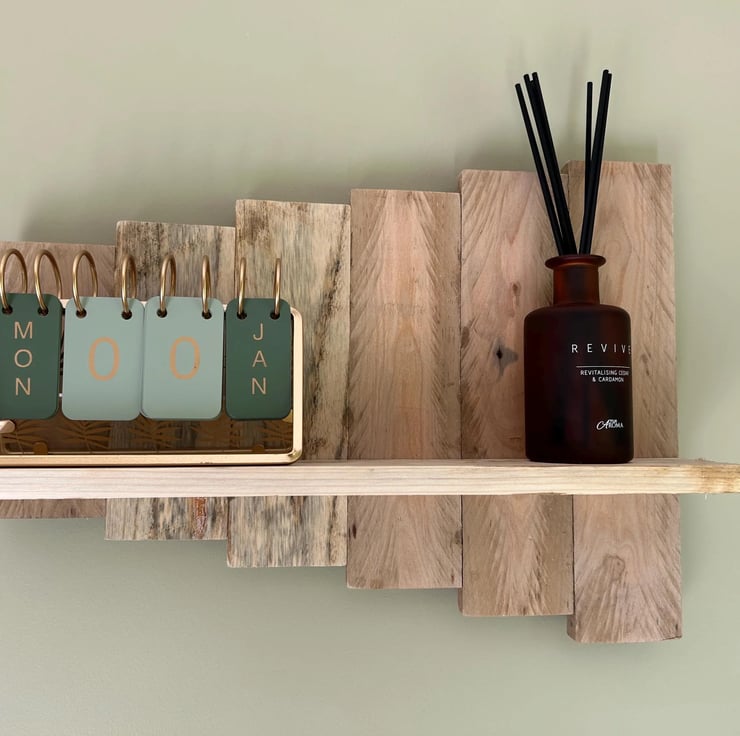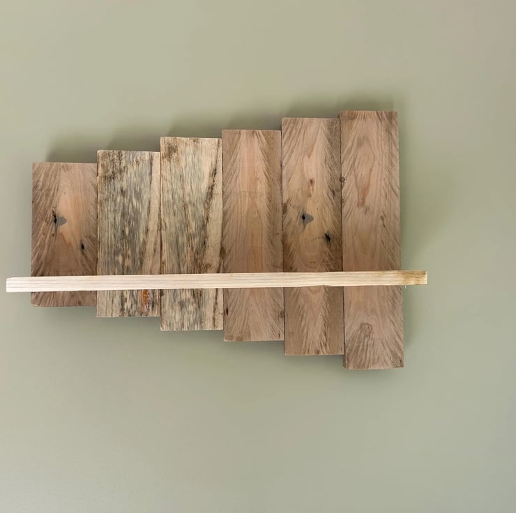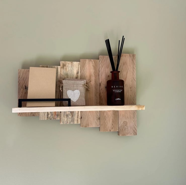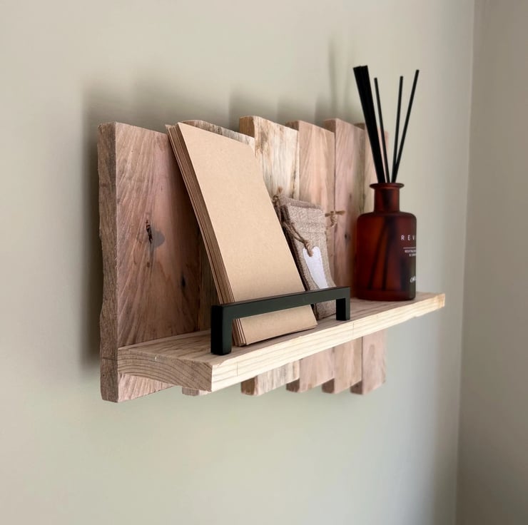 Rustic wooden shelf made from recycled pallets, provided with black shelf bracket. Size is 45cm wide x 33cm tall x 0.7cm deep. Wood is coated with a polyurethane protective coating. Can be provided with or without the metal shelf bracket.