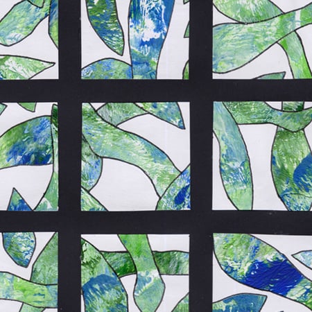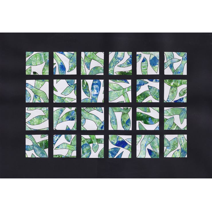 I created the collage papers using a monoprint process with several layers of blue and green acrylic paints, blended to give a variety of shades. The textured papers were cut into random shapes and pasted onto a white cartridge paper, then outlined in black fineliner. This sheet was cut into squares which were arranged in a pleasing grid design on acid free black card.