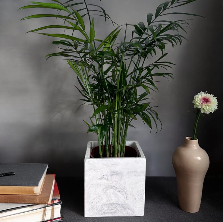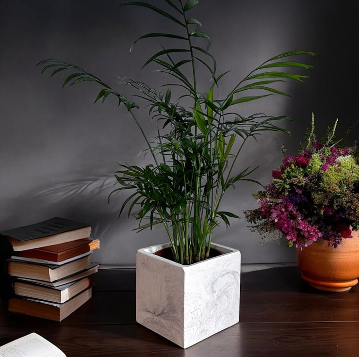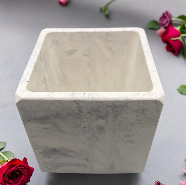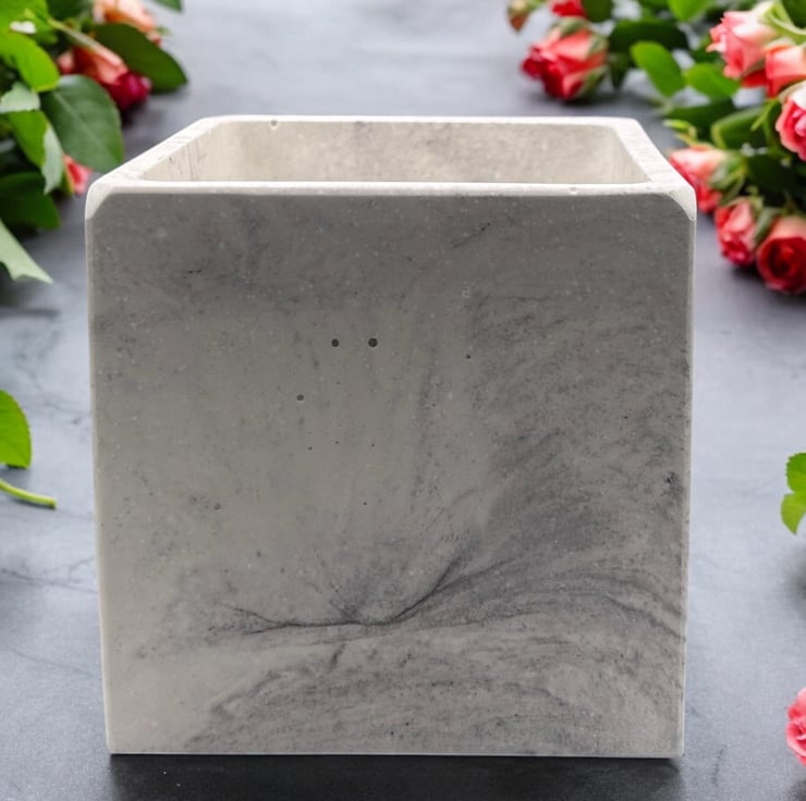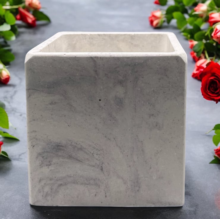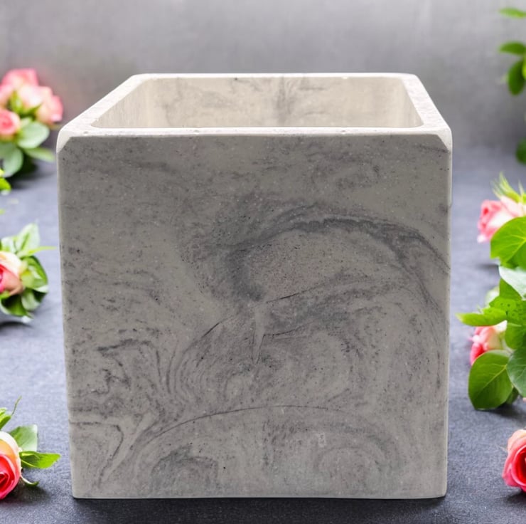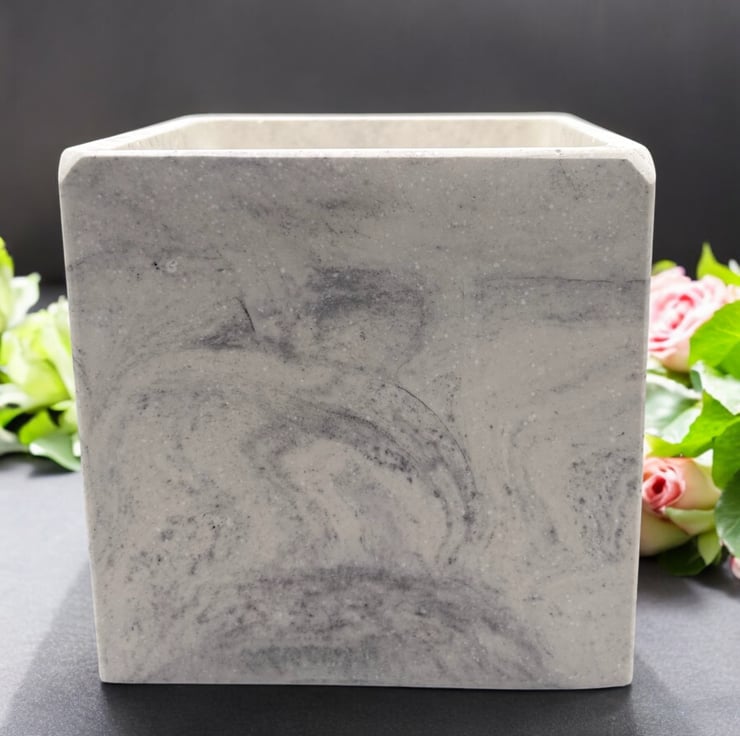 I was inspired by the beauty of marble to create this white plant pot cube with grey marbling. It is carefully handmade from Cassini’s outdoor plaster, a material often used for sculpting and for the restoration and repair of marble and stone. This gives the pot a smooth, tactile finish similar to marble, while also ensuring it is both water- and weather-resistant. Its neutral colors make it suitable for most interior design styles, making it an ideal gift or a lovely treat for yourself.